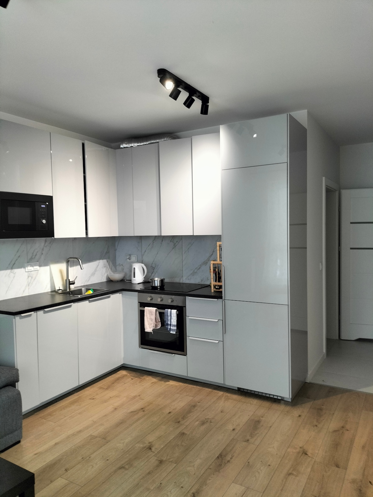 Stylish, fully equipped apartment with balcony and air conditioning. Located in a new, quiet housing estate on Wiktoryn Street. - living room with access to the terrace connected to the kitchen. - separate lockable bedroom with Kings Bed and wardrobe. - living room with a sofa bed, Smart TV, work desk - bathroom with shower and washing machine - two shopping centers nearby: Blue City, Reduta - grocery store in the building - only 400m Railway Station - (city rail) -close to the Airport
