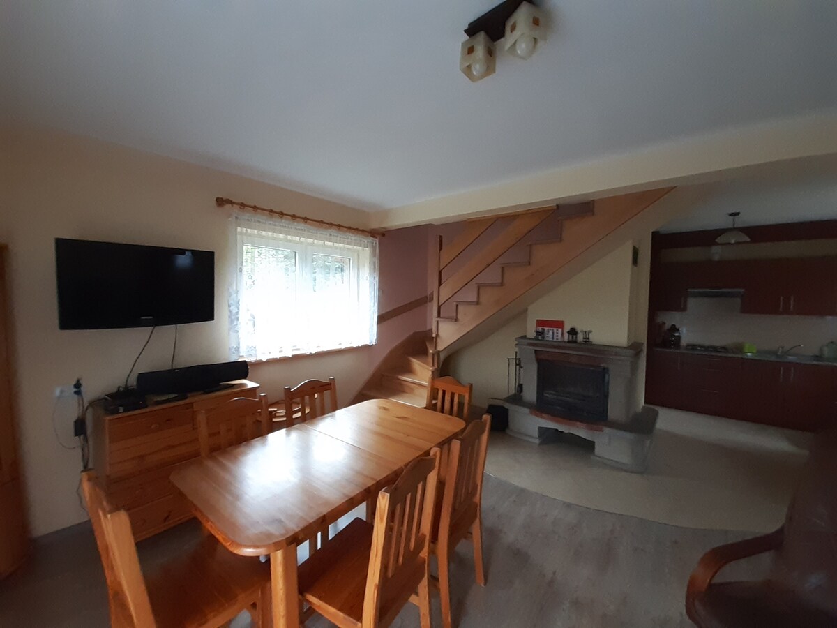 Comfortable cottage opened in June 2021, located in a charming, quiet place, surrounded by a forest. There is a large garden with two ponds at the private disposal of guests. A garden grill/ fireplace are available. Distance to the nearest buildings is ap.100 m. WHAT MAKES US SPECIAL? One house on a large plot, lovely quiet place, no close neighbors, hot tube, high-quality furniture /equipment. If you don't like relaxing in the crowd - our house is just for you!