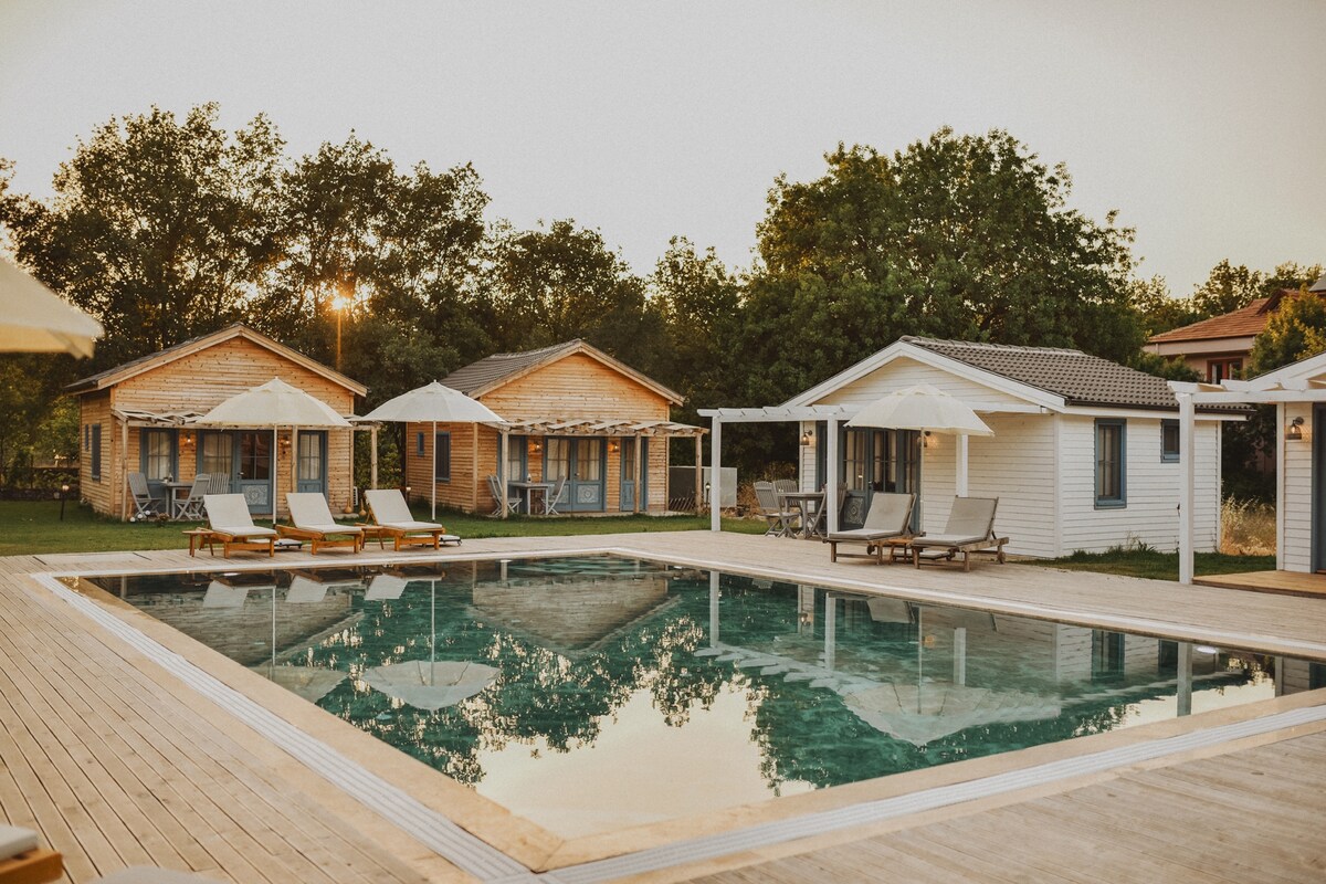 Bu unikal və sakit tətil yavaşlamağınız və dincəlməyiniz üçün nəzərdə tutulub. Təbiətlə əlaqə saxlamağın asan olduğu bir yerdə ruhunuzu və bədəninizi onun düz yanında axan axının rahatladıcı səsi və qoxusu ilə rahatlaşdıra bilərsiniz. Axşam yuxuya getməzdən əvvəl ulduzları izləyərək ruyalarınızı müşayiət etmələrinə icazə verə bilərsiniz. Şəxsi verandanızın, hovuzun, cakuzinin və bağınızın dadından istifadə edə bilərsiniz. Sizə ev sahibliyi etməkdən artıq məmnunuq.