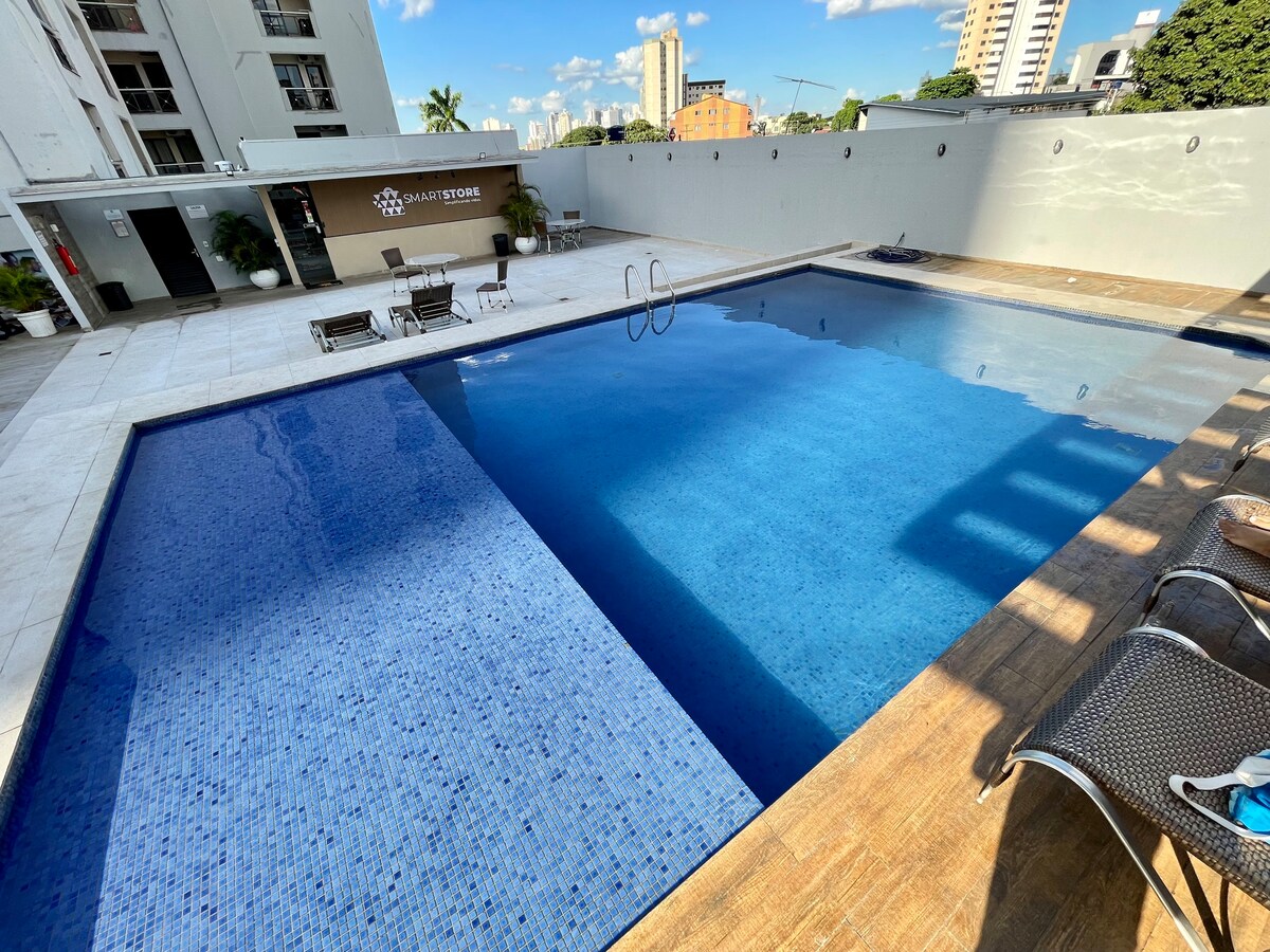Buenonun mərkəzində və Goiânia Shopping-dən cəmi bir neçə addım məsafədə yerləşən bu mənzil rahat qonaqlama axtaranlara rahatlıq və komfort gətirir. Cəmi 3 çarpayısı olan 2 yataq otağı və divan-çarpayı ilə 5 nəfərin rahat qonaqlamasına imkan verir və üzgüçülük hovuzu, idman zalı, camaşırxana və iş yeri olan super müasir binada yerləşir. Qonaqlarımıza yataq dəstləri, ədyallar və dəsmallar təklif edirik ki, qonaqlama müddətində heç nə ilə bağlı narahat olmasınlar.