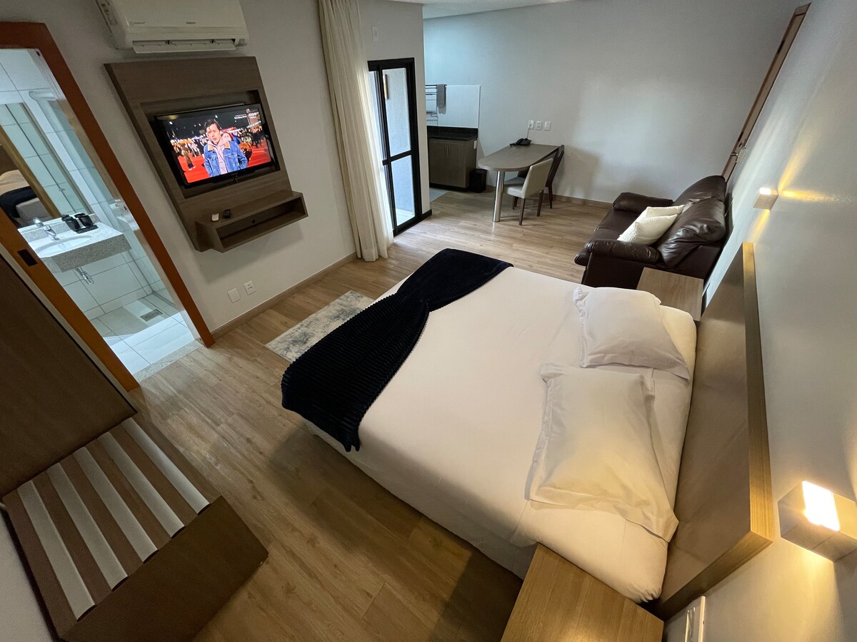 Sinta-se em casa neste flat moderno e sofisticado, vizinho ao Complexo Órion e aos melhores restaurantes. No encontro entre o St. Marista, St. Bueno e St. Oeste. Ideal para quem busca conforto e boa localização, sem abrir mão da praticidade de hotel. Aqui você descansa em roupas de cama de excelente qualidade e toalhas 100% Algodão Para quem é apaixonado por café, máquina Nespresso com cápsulas de boas-vindas, além de cafeteira e pó de café selecionado para quem prefere o método tradicional.
