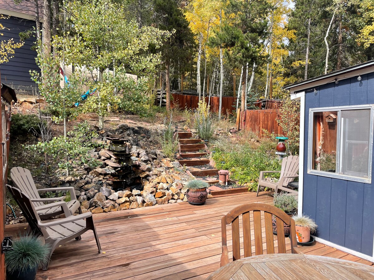 Sunny modern mountain cabin surrounded by aspens and expansive mountain views. Discover a less discovered part of the Rockies. Soak in the hot tub and stargaze amongst the trees as the snow begins to fall. Enjoy cozy evenings around the fireplace or outdoor fire pit. Located near the iconic Peak-to-Peak scenic highway. Only 45 min to Red Rocks, 15 min to Nederland/Eldora Ski Area, and 10 min to the casinos in downtown Black Hawk. Beautiful hr drive on backroads to RMNP.