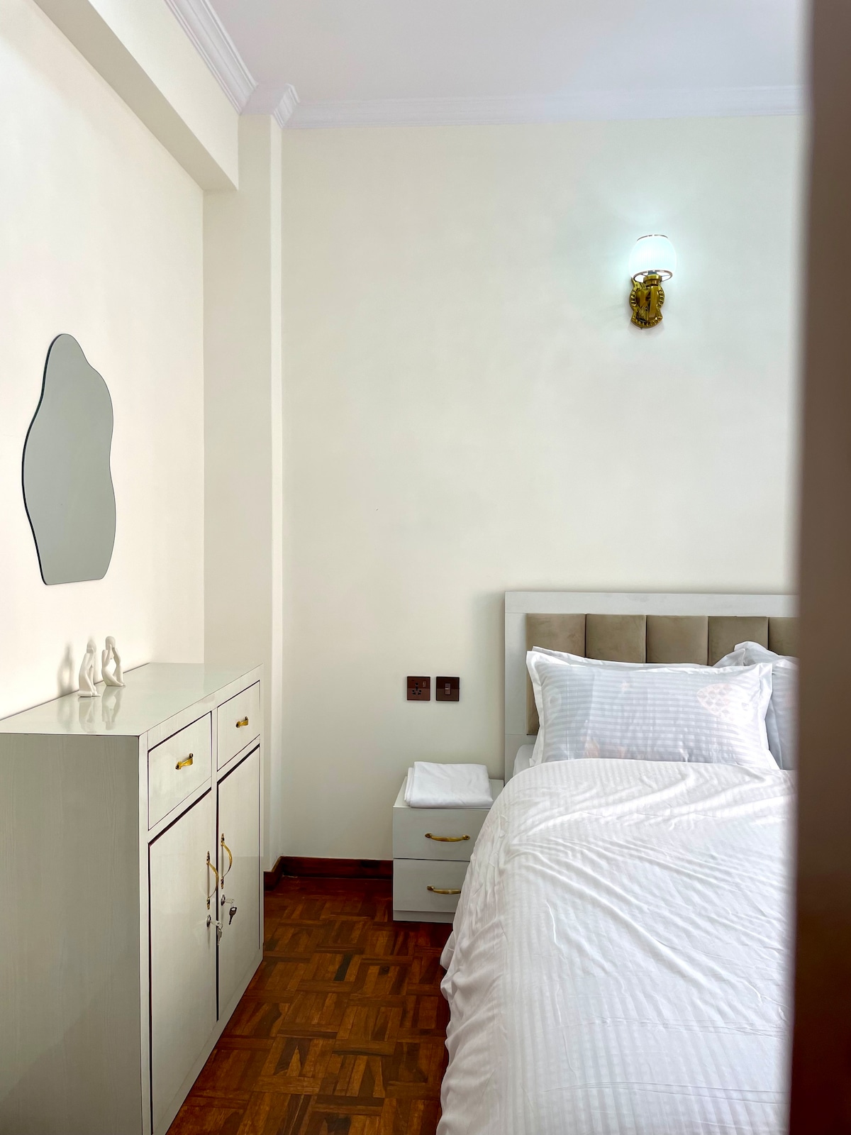 Experience a sleek and modern 2-bedroom retreat just a short walk from the iconic Boudha Stupa. The master bedroom features a king-sized bed, AC, and a TV, while the 2nd bedroom offers a comfortable single bed. Unwind in the shared lobby area upstairs or step out onto the terrace to enjoy magnificent views of Boudha Stupa, nearby monasteries, and the serene hills of Kathmandu Valley. Ideal for people who are here for sightseeing, spiritual journeys, or simply a relaxing stay with modern comfort.