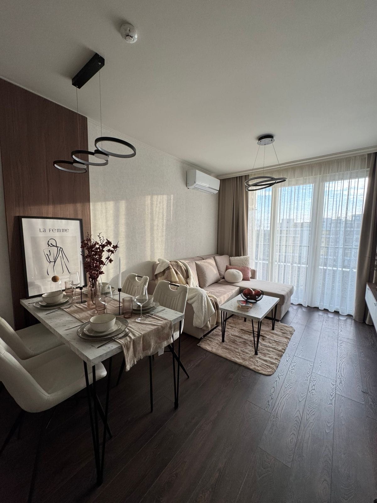 Modern and cozy apartment in the center of Burgas, just 5 minutes (350 m) from the beach. Features a stylish bedroom with soft lighting, a comfy sofa, smart TV, air conditioning, and fast Wi-Fi. The kitchen is fully equipped with a stove, microwave, fridge, and dining area. The bathroom is fresh and functional. Apartment located near restaurants, shops, and transport — perfect for a beach getaway, romantic stay, or working remotely.
