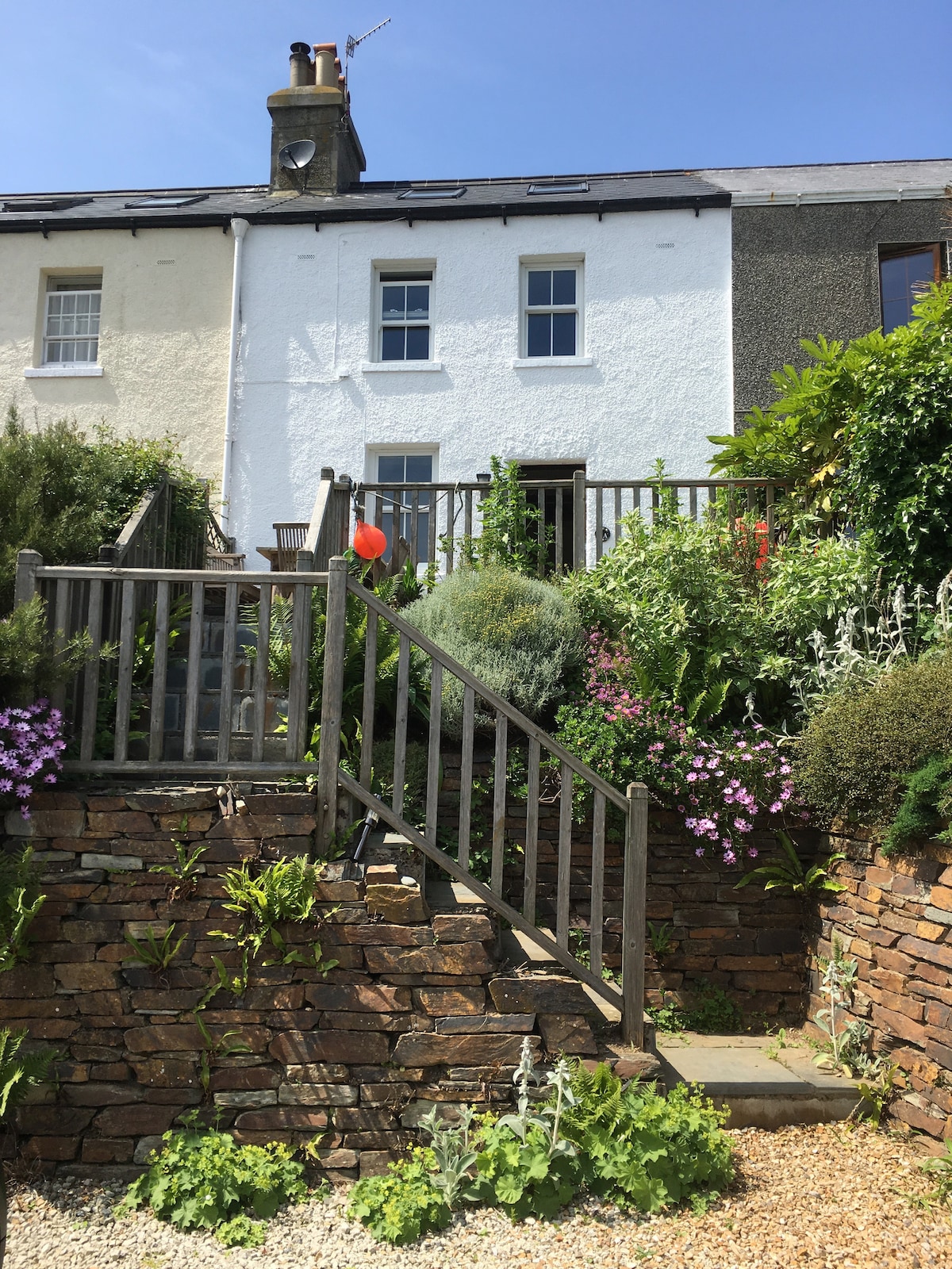 Sea, harbour + hillside views from front rooms + terrace in this recently renovated 3 bedroom 3-storey coastguards cottage, accommodating up to 6 people. Openplan groundfloor with morning sun at front + evening sun at back. Modernly furnished, comfortable + well-equipped. Back garden + BBQ. On the coastal path, within historical fishing village - 3 mins walk to beach + harbour. You can see, hear + smell the sea! Sat-Sat in school hols. Discount for 7 days+. Sliding scale for occupancy Bliss!