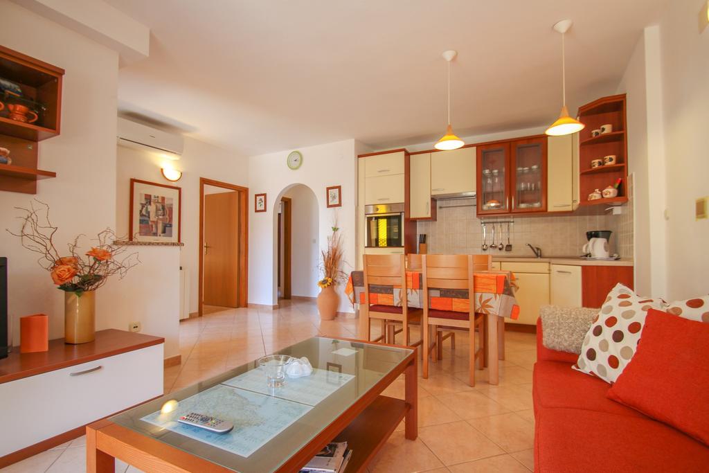 Apartman u prizemlju privatne kuće s odvojenim ulazom i privatnim parkingom u zatvorenom dvorištu. Apartman se nalazi u mirnom kvartu u neposrednoj blizini centra grada. Plaža, trgovine, restorani, kafići, tržnica, ribarnica, mjenjačnica i znamenitosti su u rasponu od 50 do 500m udaljednosti. Jednom kad gost parkira auto, on mu više nije potreban za vrijeme boravka jer su sve navedene značajke dostupne pješice. Apartman je pogodan za obitelji sa djecom i za parove
