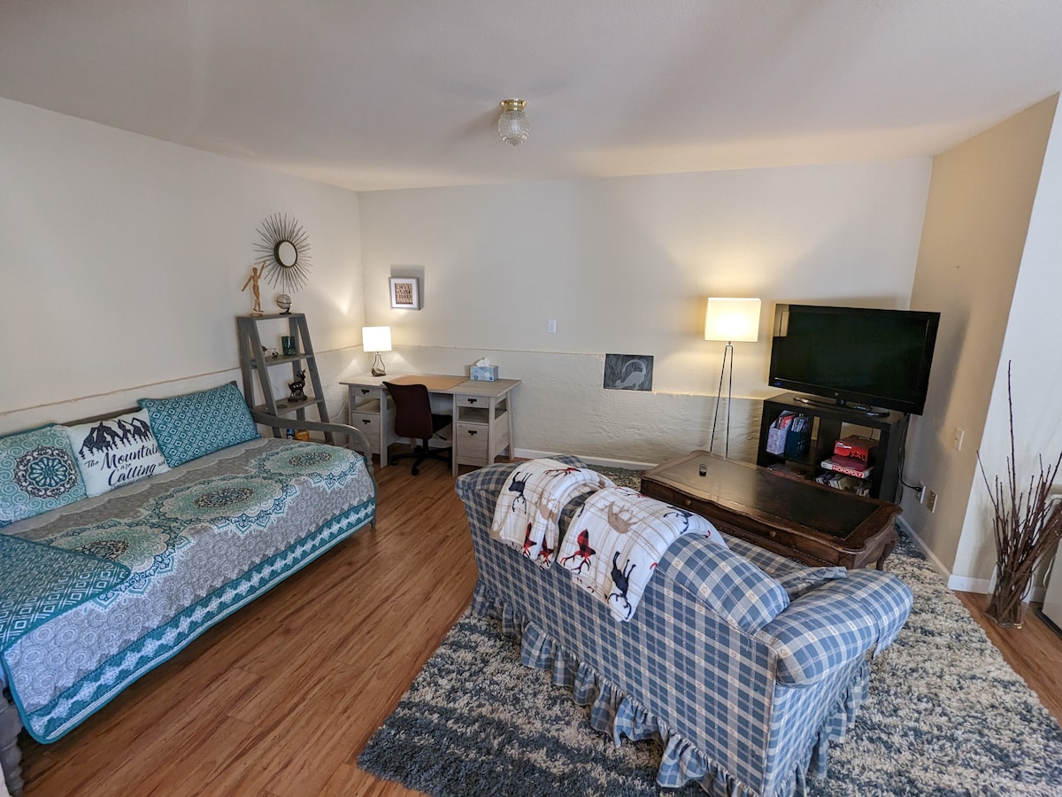 Looking for a magical mountain get-away? Look no further! Guests will easily make themselves right at home in this spacious, walk-in basement apartment with panoramic views. A quick 5 minute drive up Grizzly Rd from hwy 70 makes it easy to access Portola and everything else Plumas County has to offer. High speed fiber optic internet. No cleaning fee.