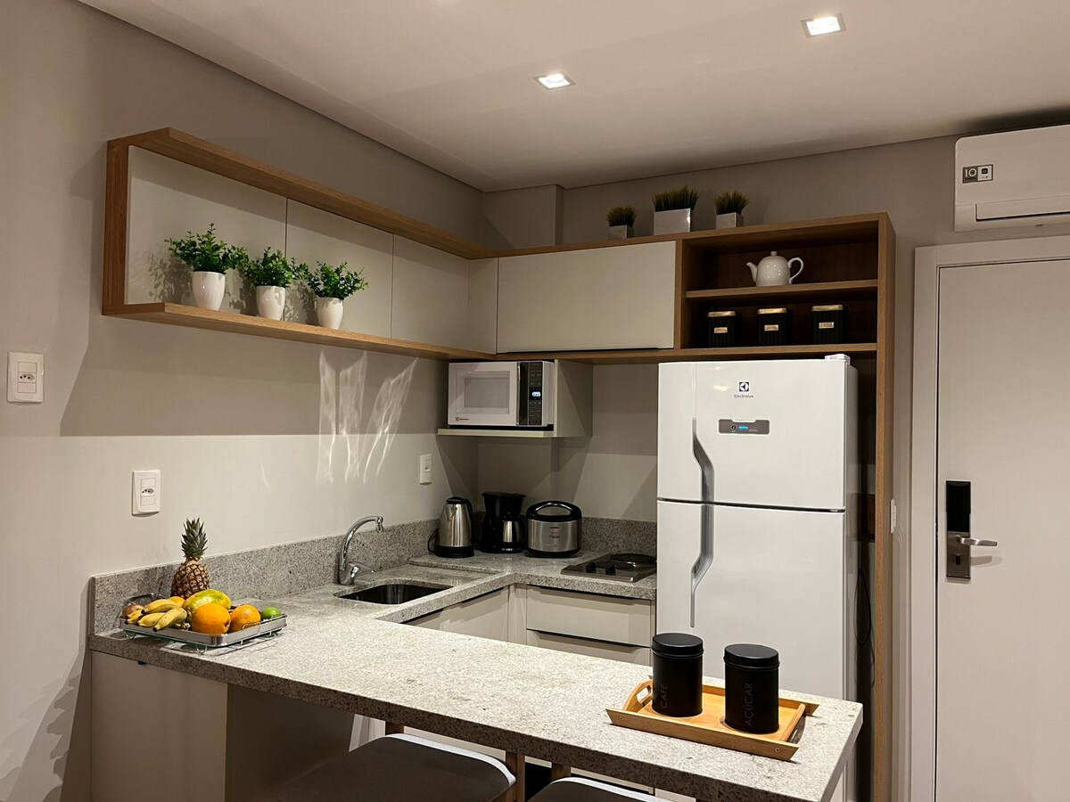 Bütün infrastruktura malik Sky Borges Otelinin daxilində yerləşən mənzil: pulsuz parkinq, qızdırılan üzgüçülük hovuzu, sauna, cakuzi, uşaqlar üçün yer, bodibildinq otağı, yataq dəstinin dəyişdirilməsi, çimmək və otağın təmizlənməsi (kameralar QABLARI YUMAYIN). Ar, ağıllı TV 42", kabel televiziyası, Wi-Fi və minibar, elektrik sobası, elektrik piştaxtası, hava fri və mikrodalğalı sobası olan minikozinha. Səhər yeməyi daxil deyil, lakin birbaşa çıxış zamanı istehlak edilə və ödənilə bilər.