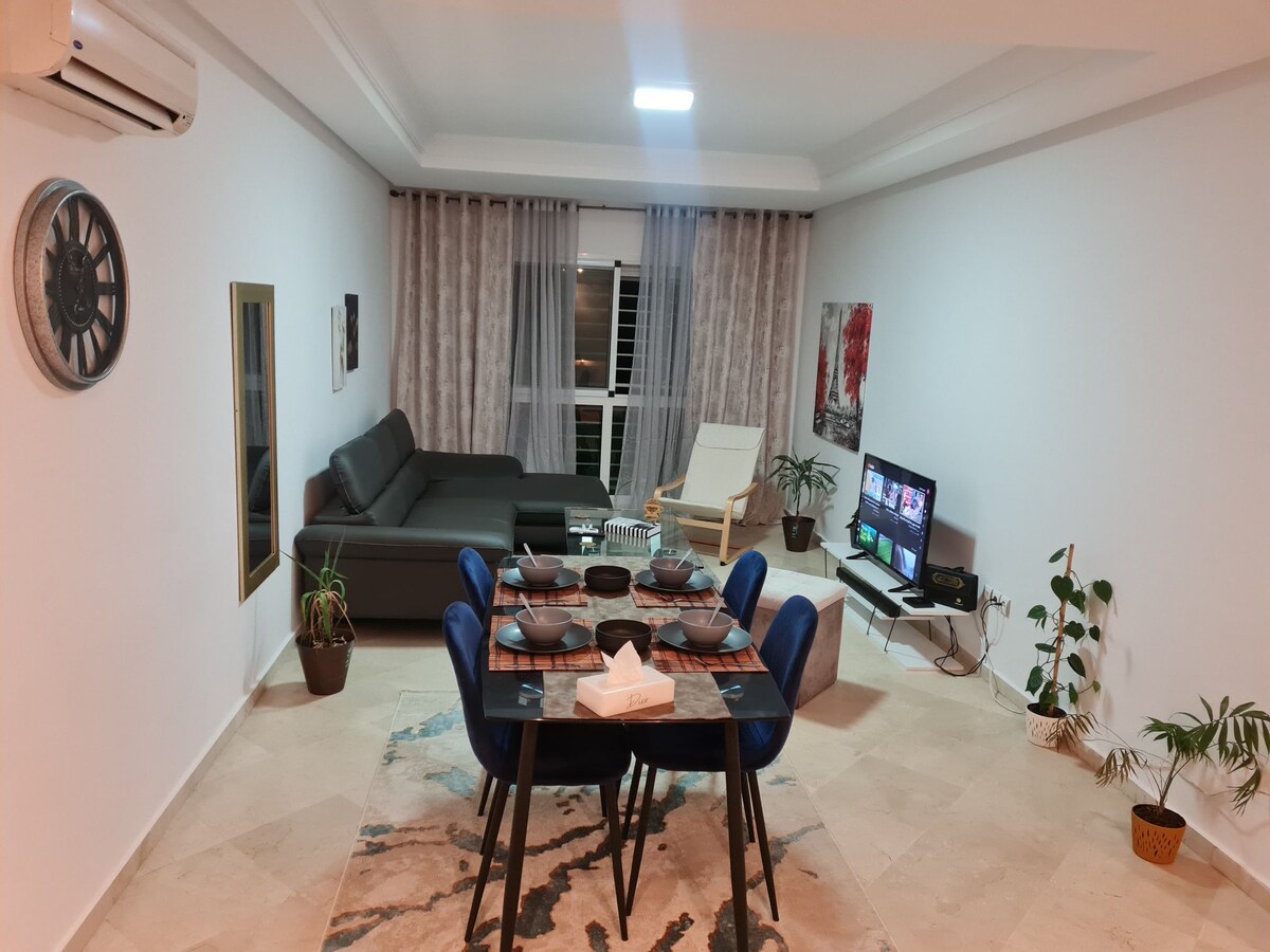 Ce logement paisible offre un séjour détente pour toute la famille. Résidence propre et sûr avec une sécurité 24h/24h , à 2 mn de la plage, avec 2 piscines, un terrain de foot, basket,pétanque et un parc de jeu pour enfants. L'appartement est situé au premier étage il est composé de 2 chambres,salon et un grand balcon vue sur piscine, une cuisine américaine bien équipée, Wifi,télé..dans la résidence il y'a un café, une supérette ..