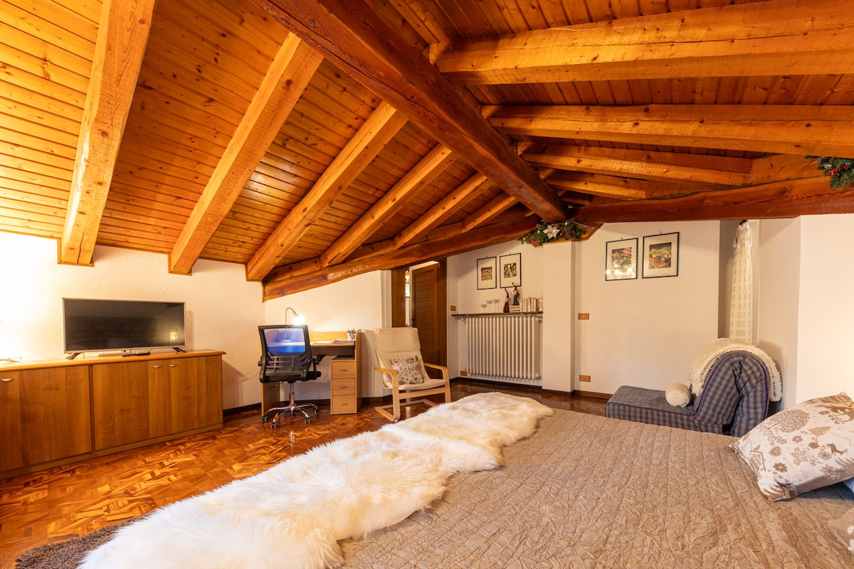 Alp dağları. İtaliya. Aosta Vadisi. 1600 metrlik kiçik bir kənddə, çəmənliklərin rahatlığında, inək və dağların otarılması. Qışda qar (adətən). Damın qədim şüalarını qoruyub saxlamaq üçün sevərək bərpa edilmiş ürək yeri. Böyük pəncərələrdən gözəl mənzərə və sülh, istilik və istirahət axtarışında olanlar üçün xüsusi sakitlik. Mebel çox gözəldir: hər şeydən əvvəl taxta, həm də daha canlı rənglər və müasir komfortlar. Həm qarda, həm də xizəkdə sakit ekskursiyalar.