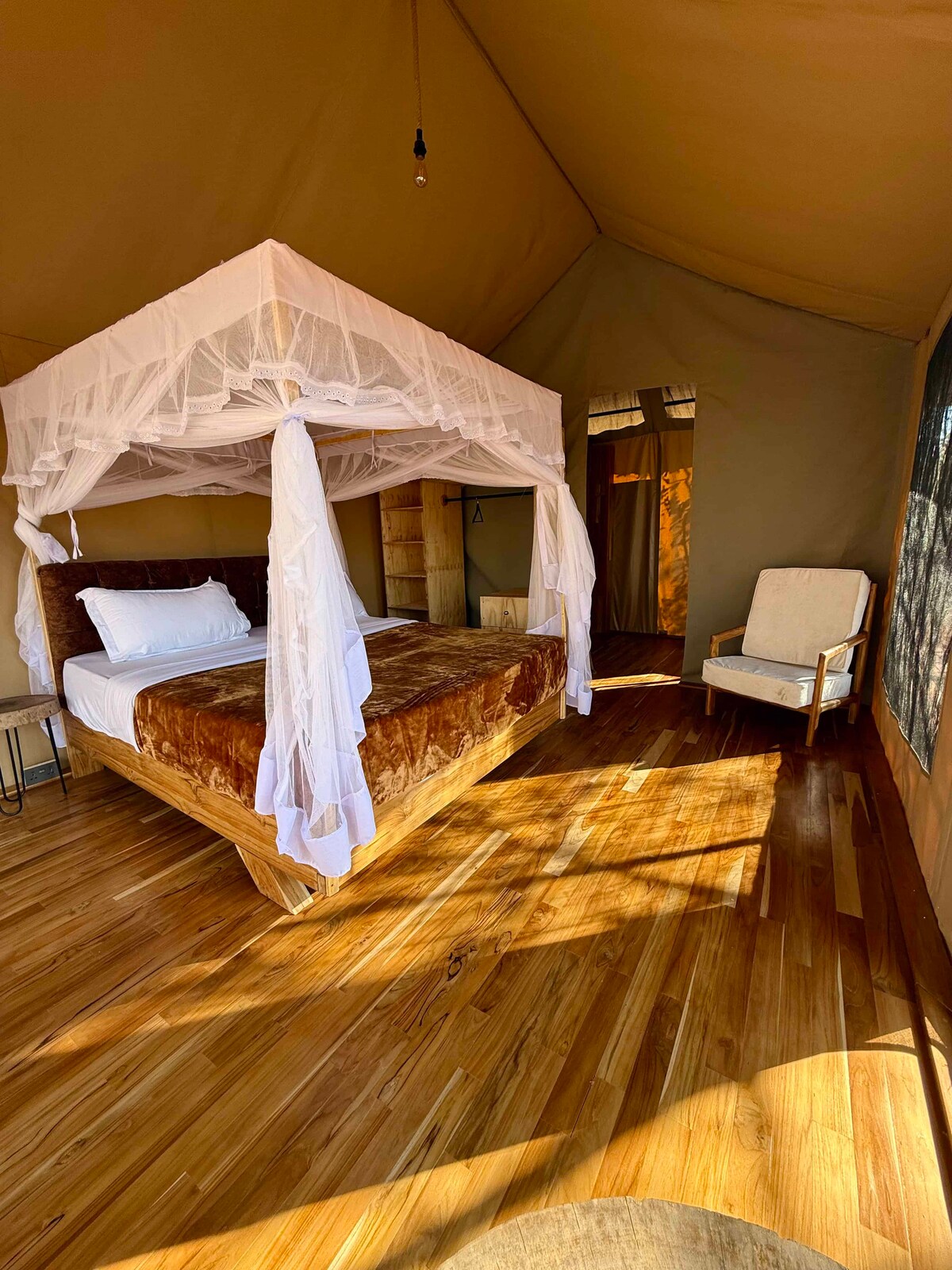Step into your luxury safari tent, elevated on a wooden deck with a private veranda where impalas, pumbas, and monkeys roam across Mikumi’s sweeping landscapes. Inside, a king-sized bed with mosquito net ensures restful nights, while mesh windows invite the natural breeze and bush sounds. The ensuite bathroom features a rain shower, elegant wooden finishes, and modern comforts. Rustic elegance meets wilderness adventure—with breakfast, lunch, and dinner included.