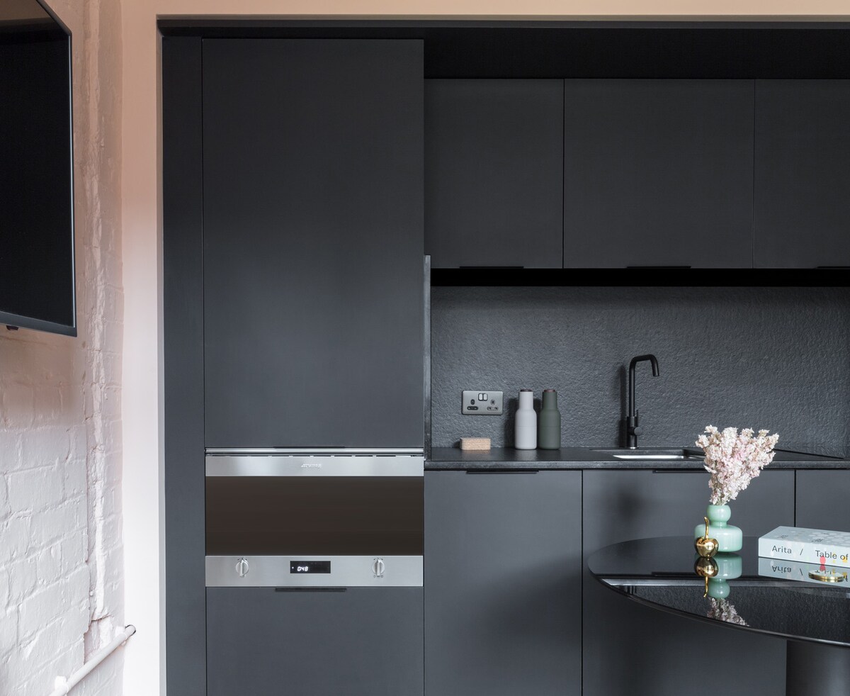 - 65sqm apartments. - Sleeps 3 - Double bed (180x200cm / 71x79in). An additional single bed is available on request. - Fully-equipped kitchen (dishware, cookware, dishwasher, fridge, microwave). - Coffee machine with pods. - Washer/dryer in-unit. - Dining table, sofa, arm chair and smart TV. - Ultra high-speed Wi-Fi. - Modern bathroom with shower, towels, and Bramley toiletries. Every apartment is unique, so your space may differ slightly from photos.