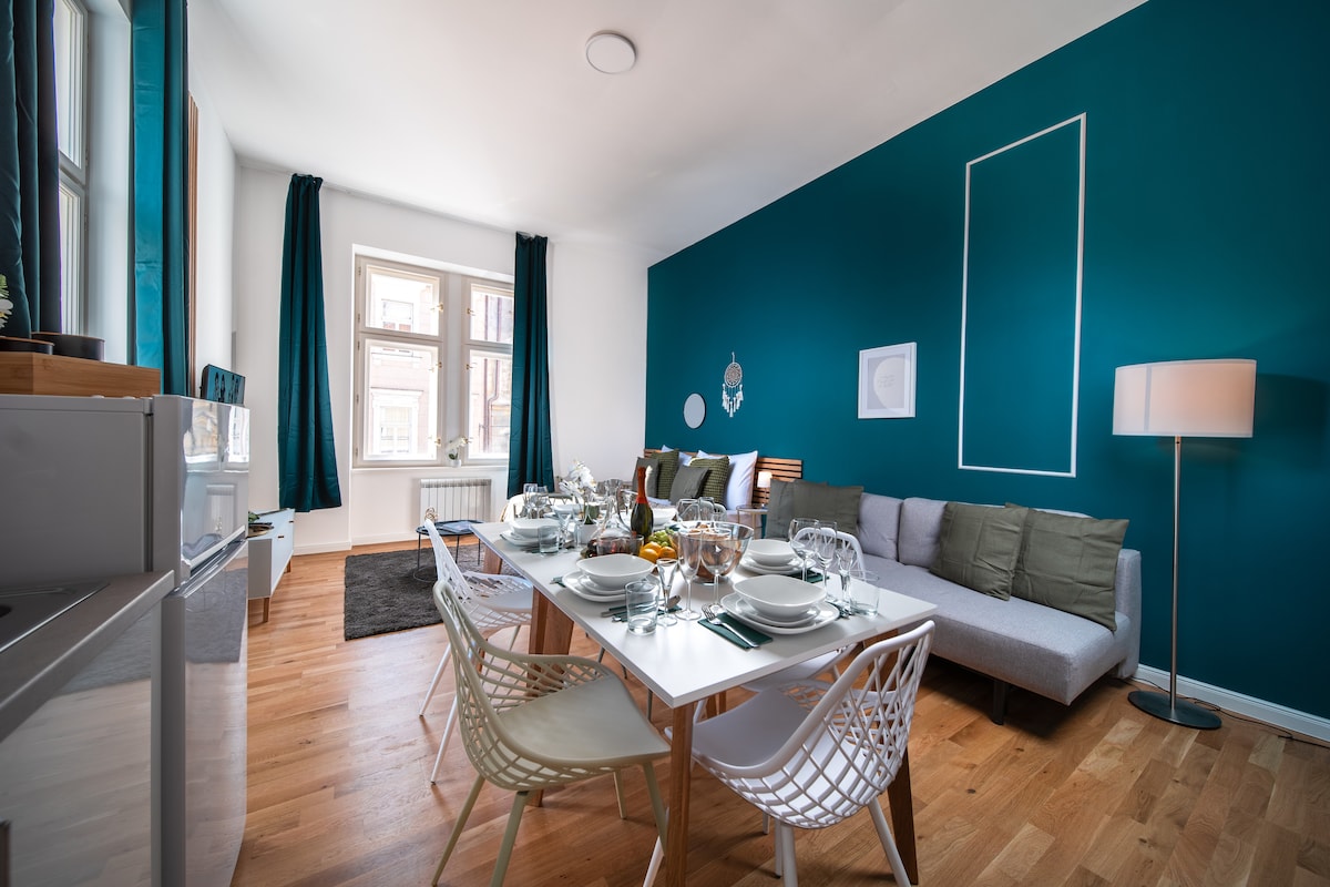 Mənzil lift və yüksək səviyyəli təhlükəsizliyi olan tam yenidən qurulmuş binada yerləşir. Bu geniş mənzil tarixi Şəhər Mərkəzindən cəmi 10 dəqiqəlik məsafədədir. Burada Kraliça Ölçülü Yatağı olan 2 nəfərə qədər qonaq rahat yerləşə bilər. Həm qısa, həm də uzunmüddətli qonaqlamalar üçün zövqlə təchiz edilmiş mənzil Ağıllı TV, yüksək sürətli Wi-Fi və tam təchiz olunmuş mətbəx də daxil olmaqla bütün müasir komfortları təklif edir.