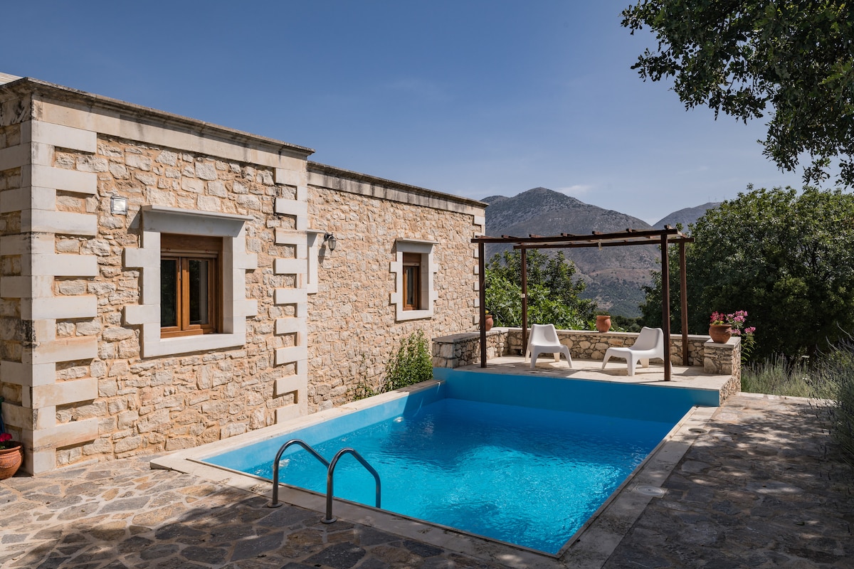 Ev bu yaxınlarda təmirdən çıxmış, ekoloji təmiz materiallarla təchiz edilmiş daş evdir və bütün müasir komfortlara malikdir. Burada 1 ikinəfərlik çarpayı və 2 nəfərlik divan, mətbəx və hamam otağı var. Kənddə, zeytun ağacları, otları olan orqanik fermamızdan 400 m məsafədə və tərəvəz fermamızdan 2 km məsafədə yerləşir. Qonaqlar aktrivities-də iştirak edə bilər və işləyir, həmçinin fermadakı terrajdan, mini hovuzdan və velosipedlərdən istifadə edir. Gözəl çimərliklərə, Knossos və hava limanı kimi qədimlərə də yaxındır [28']