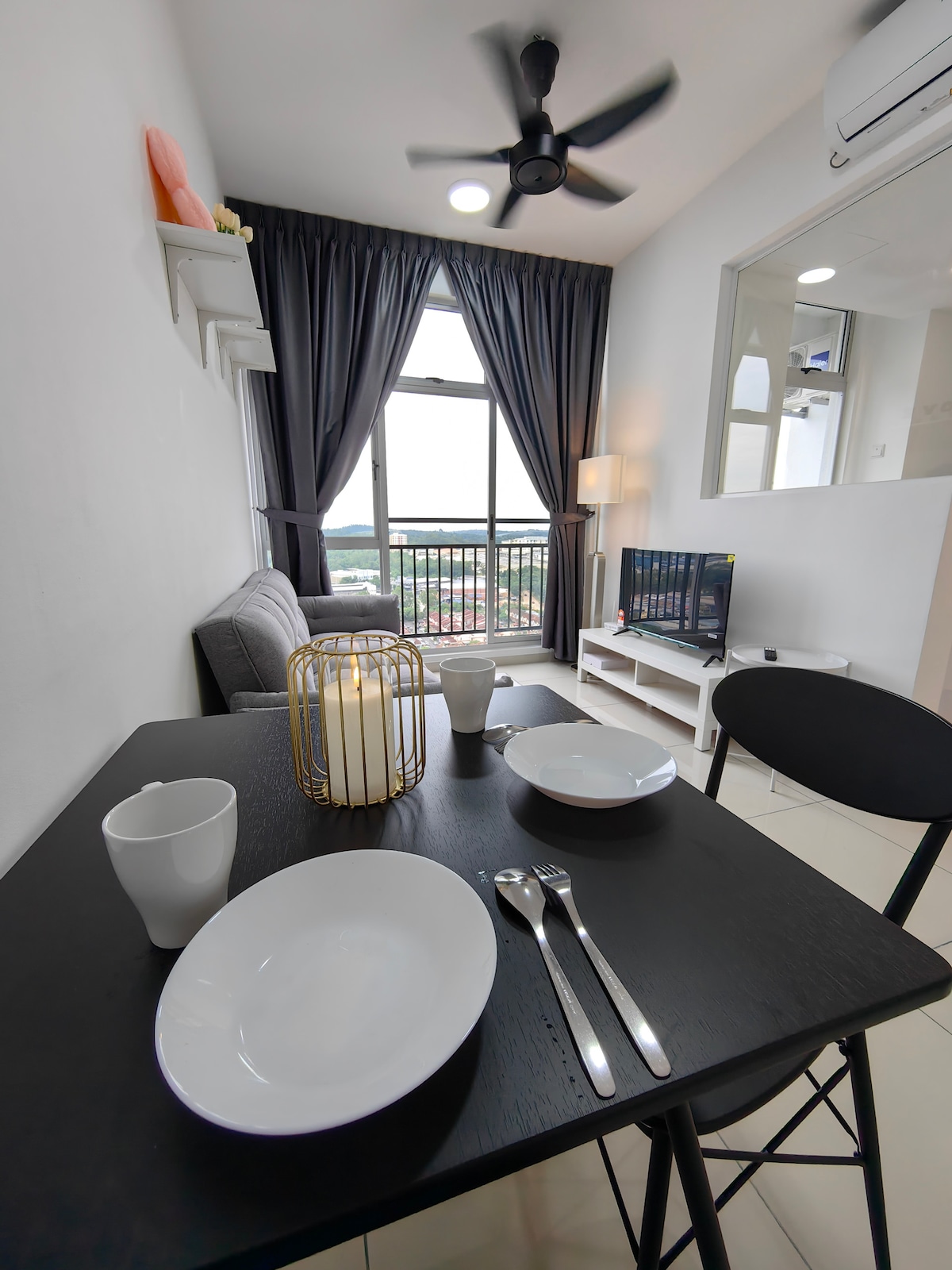 This is a spacious 2Bedroom unit perfectly fit for guests up to 5 pax with total of 1 king size bed 1 queen size bed 1 single bed High floor with high view. 1. Basketball Court 1. Gym Room 2. Function Hall 3. Lounge 4. Library 5. Manicure Shop 6. Mini Theatre 7. BBQ Deck 8. Swimming Pool 9. Sauna 10. Jacuzzi 11. Game room (Pool Table, PS Room, Darts and more) 12. Laundry 13. Mini Market -Sky Garden Guest are not allow to smoke in the room , please smoke at the balcony if needed
