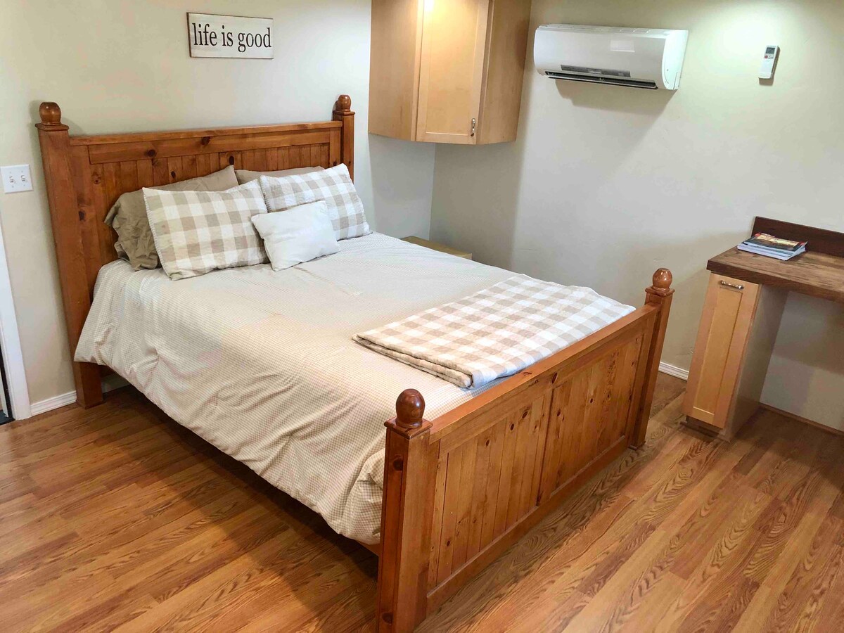 Please Read! Very Private, 170 sq’ bedroom queen Healthwise bed, TV, wifi, fridge, micro, AC & heat detached/separate from main house. Additional floor sleeping pad under bed. Small bathroom with direct/private entry & 31” shower is part of main house. Guest must walk outside & under patio cover to access bathroom. Private outdoor sitting area & shared covered patio with sink/disposal (summer), grill & nice yard. Well lit free street parking. Host and his dog “Elvie” live on site.
