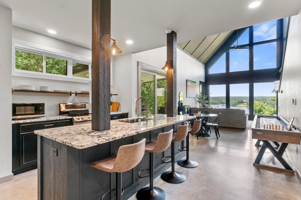 Our charming mountain-modern waterfront lakehouse is perched atop a bluff near a beautiful wedding venue. A public boat launch is just 1 min away, and the jumping cliffs in Snakehead Cove are a short/bike/ATV ride. Enjoy guest passes to amenities like pickleball/tennis courts, 3 pools, bowling alley, Hart Health Center w/indoor pool, mini golf, Mountain Ranch & Indian Hills Golf Course. 90 miles of ATV/UTV trails. Jannsen’s Lakefront 15 min away, and…THE LAKE! ⚠️ Many amenities are seasonal ⚠️