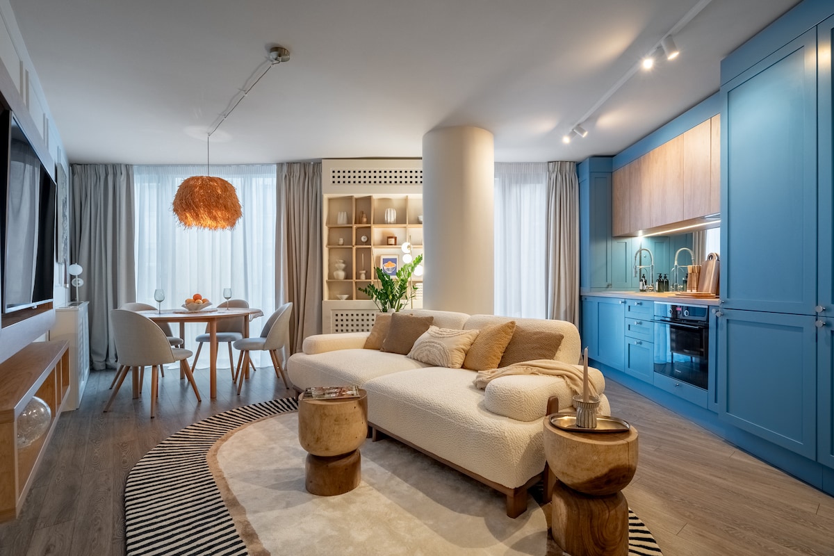 2022-ci ildə dizayn edilmiş, tam təmirli və dəbli mebellə təchiz edilmiş mənzil şəhərin mərkəzində əsas bulvarda binanın 8-ci mərtəbəsində yerləşir. Əsas yeri restoran, kafe, mağaza və mədəni görməli yerlərə asan giriş imkanı təklif edir. mənzil metro stansiyasının bir neçə addımlığındadır və şəhər daxilində rahat nəqliyyatı təmin edir. Geniş terras şimal-cənub oxunun heyrətamiz panoramasını təmin edir. Bir qədəh şərabla dincəlmək üçün mükəmməl yerdir.