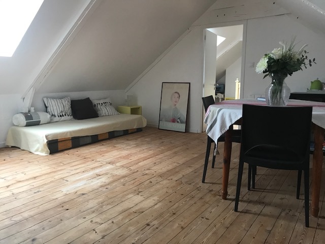 AYRICA evin 2-ci mərtəbəsində geniş, işıqlı və şəxsi qonaqlama yeri Müstəqil giriş (təhlükəsiz qapı) Biz birinci mərtəbədə yaşayırıq Qıfıllı qutu Evin qarşısında yaxınlıqdakı pulsuz parkinq və ya mavi zona Şəhər mərkəzinə, qatar stansiyasına, çimərliklərə 50 m məsafədə avtobus Florist, çörək zavodu, bərbərxana, restoran, yaxınlığımızdakı Leklerc Pulsuz Wi-Fi SmartTV Döşəkağılar və dəsmallar təmin edilir Çaydan, soyuducu, mikrodalğalı soba, espresso aparatı, ütü və ütü masası və qablar Siqaret çəkilməyən məkan