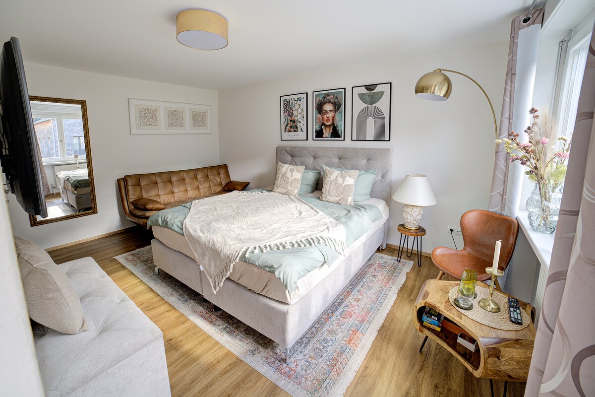 Düz-TV, şüşə lifli WLAN və böyük vanna otağı ilə çox rahat və yaxşı təchiz olunmuş mənzil. Qabyuyan maşın, soba və s. ilə tam təchiz olunmuş mətbəx.. Mənzil zirzəmidə yerləşir (6 addım aşağıda, lakin çox işıqlıdır), cənuba baxan, günəşli, sakit, ayrıca girişi olan məxfilik təmin edir. Mənzildə uşaqların, itlərin və böyüklərin tıxacdan uzaqda özlərini evlərindəki kimi hiss etdikləri 1.000 m2-lik bağ/oyun meydançası var. Qonşu evdəki birgə iş ofisimizə pulsuz giriş imkanı.