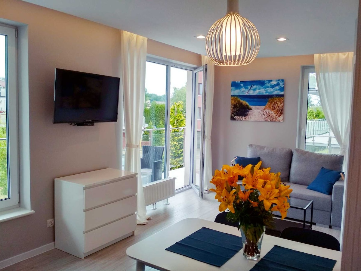 Kolobrzeg şəhərinin qərb hissəsində, Natura 2000 Parkının və Kolobrzeg çimərliklərinin yaxınlığında, Polanka Aquanın ərazisində yerləşən dəbli, iki otaqlı mənzil var. Şəhər mərkəzindən uzaqlıq qonaqlarımızın təbiətlə əhatə olunmuş rahat və sakit istirahət etməsinə imkan verir. Əmlakda saunası olan üzgüçülük hovuzu var - sizin ixtiyarınızdadır, pulsuzdur (açıqdır: hovuz 9-21, sauna 16-21), fitnes sahəsi və uşaq oyun zalı.