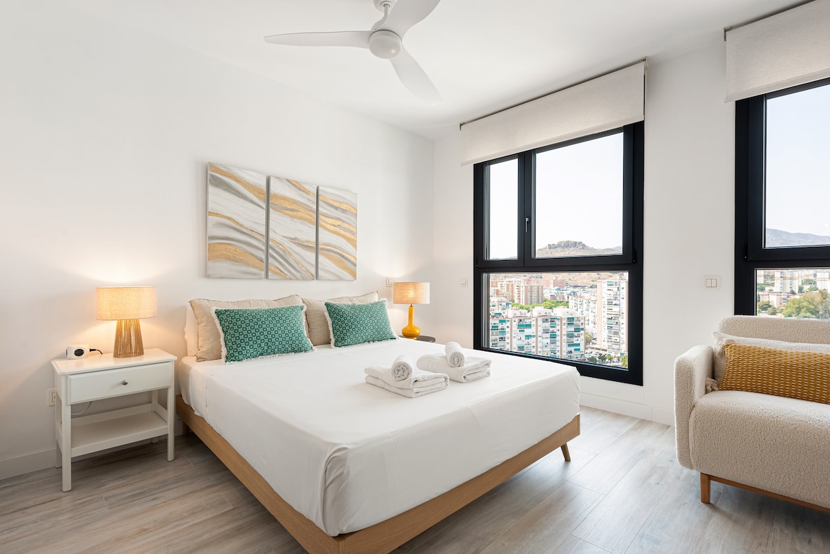Enjoy a bright and modern apartment on the 24th floor with stunning city views. Relax in the cozy living area, cook in the fully equipped kitchen, and sleep peacefully in the serene bedroom. Located in a lively neighborhood near restaurants, bars, shops, and Málaga’s attractions, it’s the perfect base to explore the city and unwind in style. Enjoy air conditioning, on-site parking, and building amenities including a rooftop pool, gym, and multipurpose room.