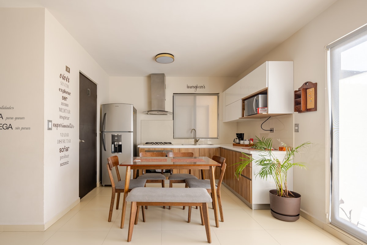Geniş, müasir və mükəmməl mövqedə yerləşən mənzildən zövq alın. Monterrey və Qvadalupedə qonaqladıqları müddətdə ailələr, qruplar, işgüzar səyahətçilər və ya rahatlıq və təhlükəsizlik axtaranlar üçün ideal seçimdir. Ərazi sakit və təhlükəsizdir, əsas prospektlərə, ticarət mərkəzlərinə, restoranlara və BBVA Stadionu, Parque Fundidora, Arena Monterrey, Cintermex və La Fe kimi əsas məkanlara sürətlə gedə bilərsiniz. İstirahət etmək, işləmək və ya şəhəri araşdırmaq üçün mükəmməldir. Sizi qarşılamaqdan məmnuniyyət duyarıq.