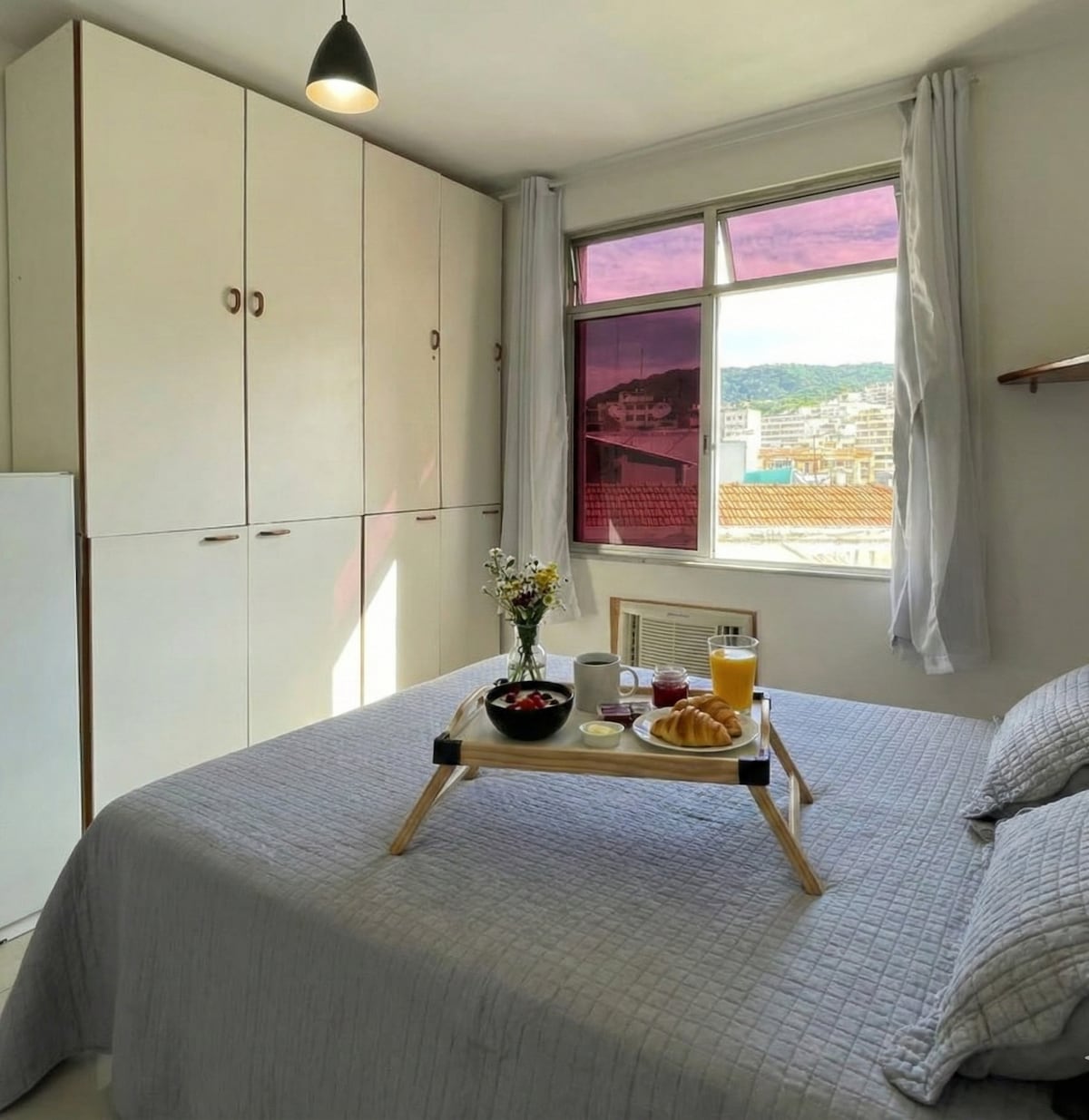 Gözəl süita , qurman balkonu, Barra da Tijuca çimərliyi, Pedra da Gávea və Kanal da Barra mənzərəsi. Mikrodalğalı soba, hava feni, sendviç maşını, qəhvə maşını, toster, minibar, çəngəl-bıçaq, boşqab, eynək və kiçik mikrodalğalı soba qabları ilə sürətli və praktik yeməklər üçün təchiz edilmiş qabyuyan maşını olan kiçik balkon. DİQQƏTDƏ SOBA VƏ YA TAVA YOXDUR. Masa və 2 stul, ikinəfərlik çarpayı, dolab və kondisioneri olan rahat otaq. İsti və soyuq su duşu olan vanna otağı.