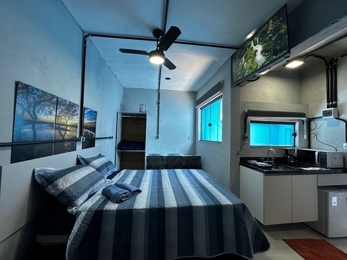 Studio completo com varanda, cozinha com utensílios, wc, armários, geladeira, TV, ventilador, passadeira a vapor, secador, Cama casal padrão 1,88 x 1,38 e wi-fi. Dispomos de espaço de estacionamento (não incluso - cobrança a parte) e área de fumante externa. Dispomos de roupa de cama e toalhas. LOCALIZAÇÃO - próx. ao aeroporto internacional e estação de trem, comércios de fácil acesso à pé como farmácias, lojas, mercados, restaurantes, bancos, SESC Guarulhos, etc.