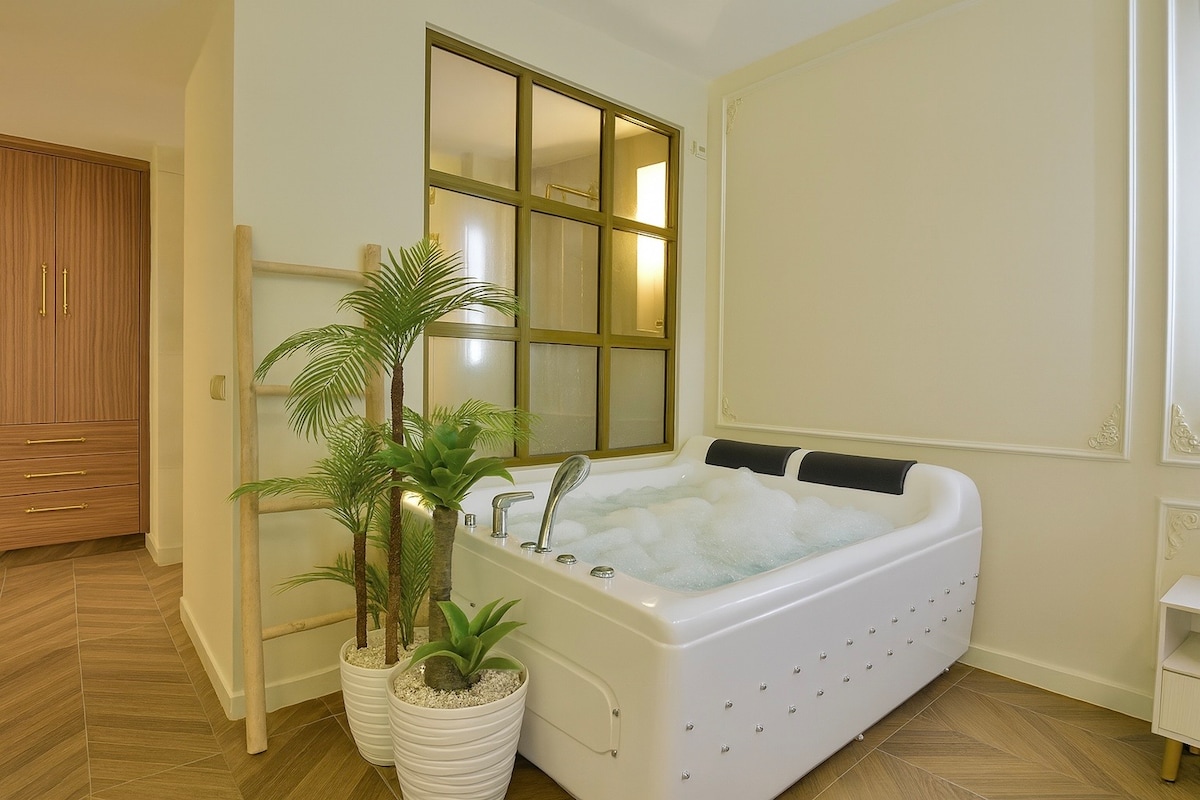Cœur de Ville • Jacuzzi Suite Enjoy a stylish Paris-inspired studio in the heart of Marrakech. This elegant suite blends French charm with modern comfort Highlights • Private in-room jacuzzi for a spa-like experience • Prime central location in the city center Gueliz • Parisian chic décor with soft tones and elegant finishes • Comfortable bed & fast Wi-Fi • Fully equipped kitchenette Perfect for couples, solo travelers, and anyone seeking a cozy, central, and stylish stay