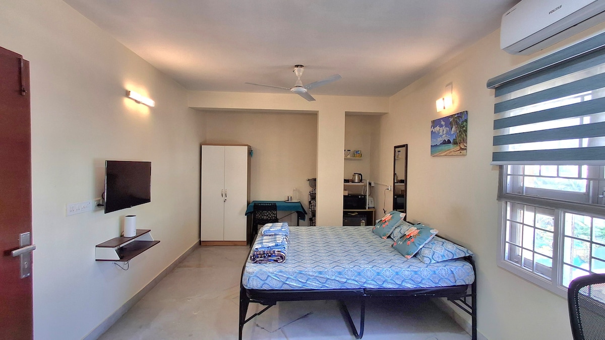 Fully furnished, newly renovated studio room with attached bathroom and kitchen. Extremely safe and located on the main road in Velachery, close to IT corridor & Phoenix Mall. Just 11 km from the airport. Unmarried Couples under 23 NOT allowed. Solo travelers above 18 are welcome. Amenities • AC • Queen-size bed • 2-seater sofa • Refrigerator, Geyser • Wi-Fi • Induction Stove • Liquid soap, shampoo & towels • Limited-period power backup (only fans and lights)