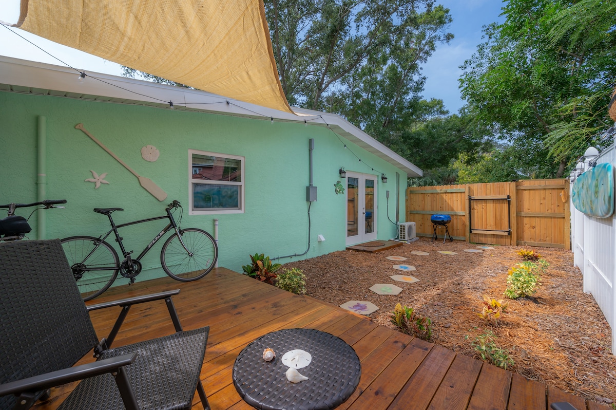 Bu unikal və rahat tısbağa istirahət məkanında özünüzü asan hiss edin!! O, Gulfport şəhərinin mərkəzinə cəmi 5 dəqiqə, St Pete Beach-ə isə 10 dəq məsafədə yerləşir. Bu rahat mənzil yeni tikilidir və yenilənmiş tam mətbəx, yeni paltaryuyan maşın/quruducu və böyük geniş duş kimi bir çox gözəl imkanlara malikdir. Burada böyük ölçülü çarpayı və əyləncəniz üçün roku Tv var. Çöldə veranda masası və stullar dəsti, açıq havadan zövq almaq üçün iki velosiped və manqal olan göyərtə var. Tətili bu gün burada bron edin!!