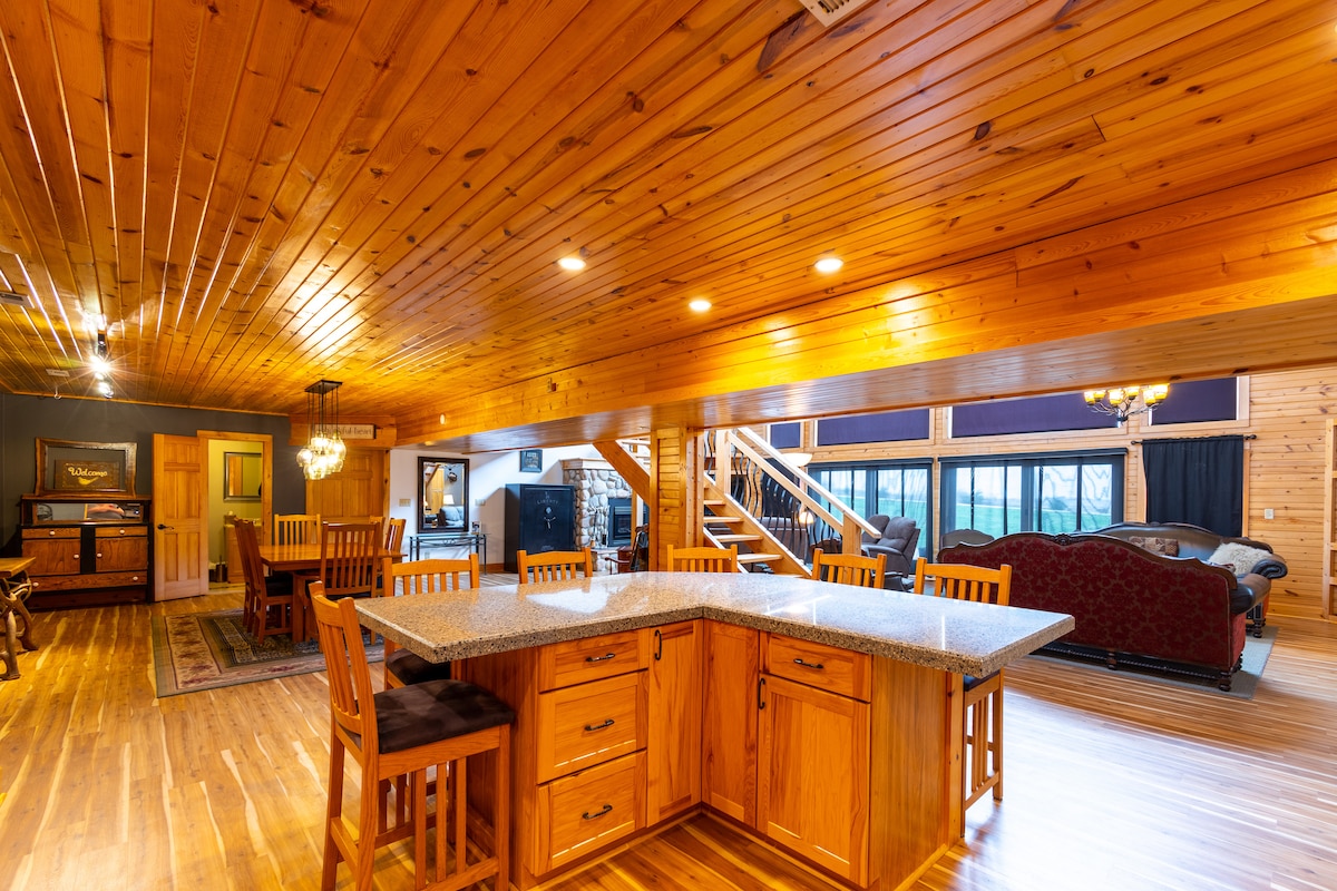 Located in the country just 8 miles north of I-80 Exit 76 between Des Moines and Omaha, this lodge-style, 4 bedroom, 2 1/2 bath home is the perfect place for a quiet weekend getaway. The home is perfectly decorated with a rustic, mountain cabin-y feel, with lots of seating for dining or playing games together, or relaxing on couches and chairs in the living room. There is a large patio outside to enjoy grilling or your cup of coffee in the sunshine.