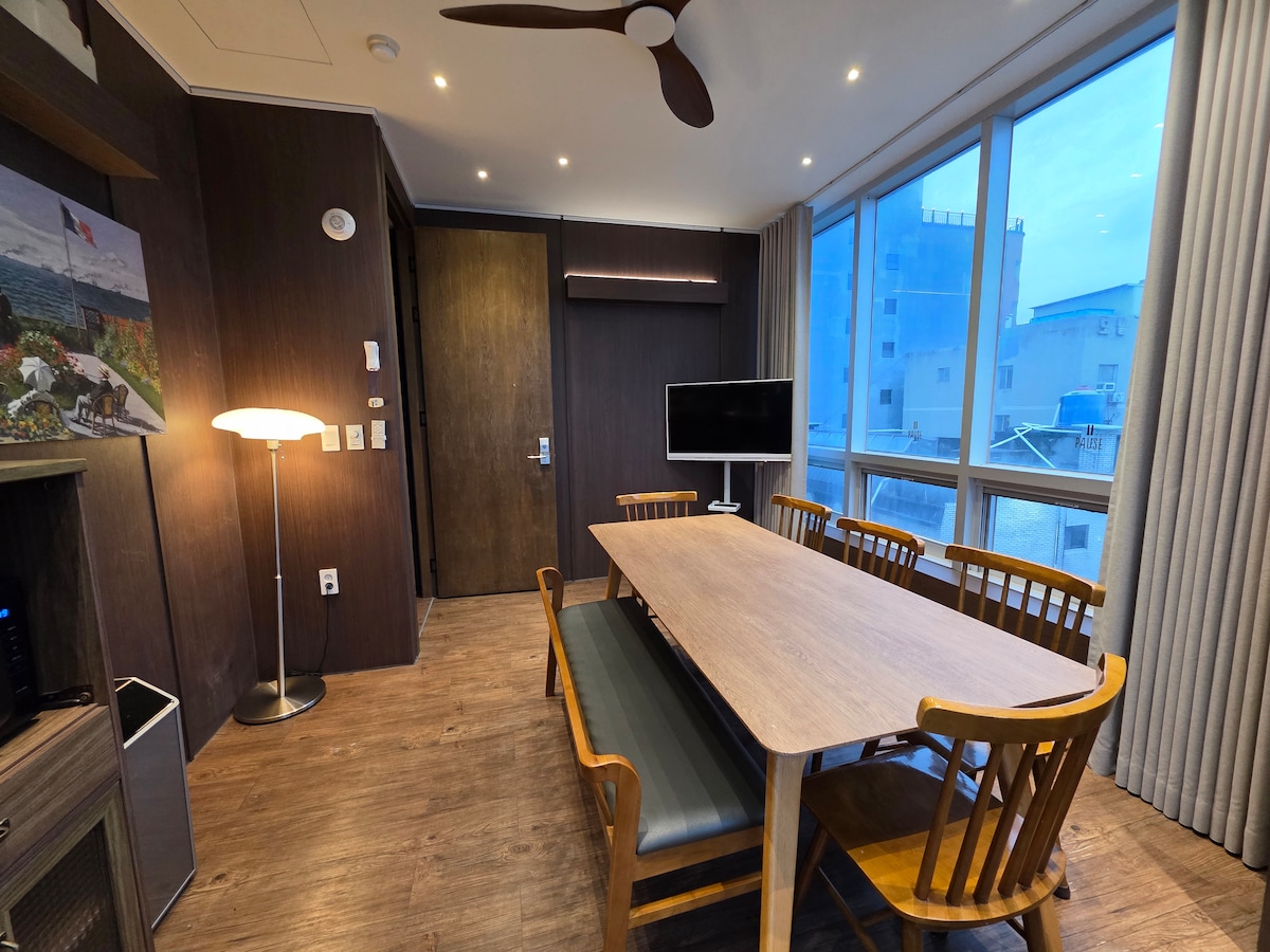 Haeundae-nin ən yaxşı sahilyanı ərazisində yerləşən əmlakımız döşəmədən tavana qədər uzanan pəncərələrdən okeanın panoramik mənzərələrini seyr edə biləcəyiniz özəl, təkailəlikli pansionatdır. Bu, bütün ailə, gəlinlik duşları, qrup səfərləri, şənlik dostluğu səfərləri, klublar və müxtəlif yığıncaqlar ilə qonaqlamaq istəyən qonaqlar üçün rahat, xoş və geniş qonaqlama yeridir. Bundan əlavə, qonaqlar üçün ayrıca parkinq var, odur ki, birbaşa otağa gedə bilərsiniz. Yaxınlıqda çoxlu restoran və əyləncə yerləri də var.