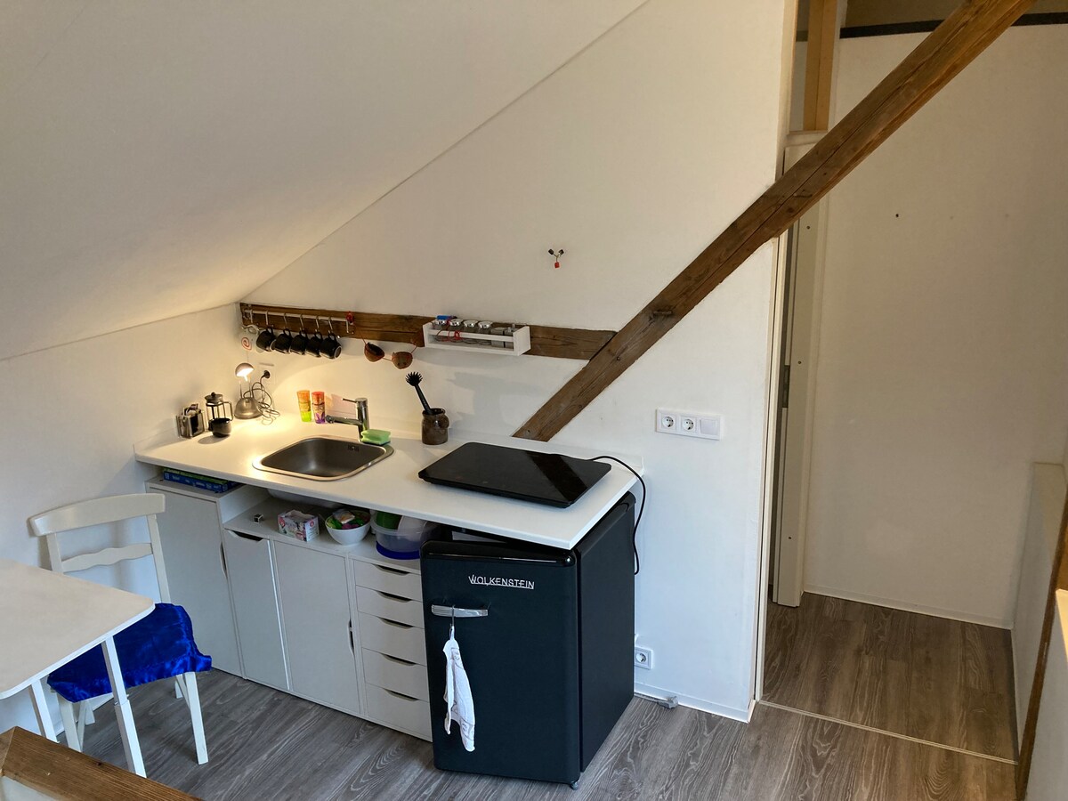 Bu sakit və mərkəzdə yerləşən qonaqlama yerində, qatar stansiyasına 10 dəqiqəlik məsafədə və şəhərin mərkəzində 20 dəqiqəlik məsafədə, S-Bahn şəhərinə 3 dəqiqəlik məsafədə sadə həyatdan zövq alın. Mənzil dik pilləkənlə daxil olaraq çevrilmiş evdir. Birinci mərtəbədə qarderob və oturma yeri olan kiçik giriş sahəsi mövcuddur. Yuxarı mərtəbədə kiçik mətbəx, oturma yeri və duşlu kiçik vanna otağı olan kiçik qonaq otağı/yataq otağı var.