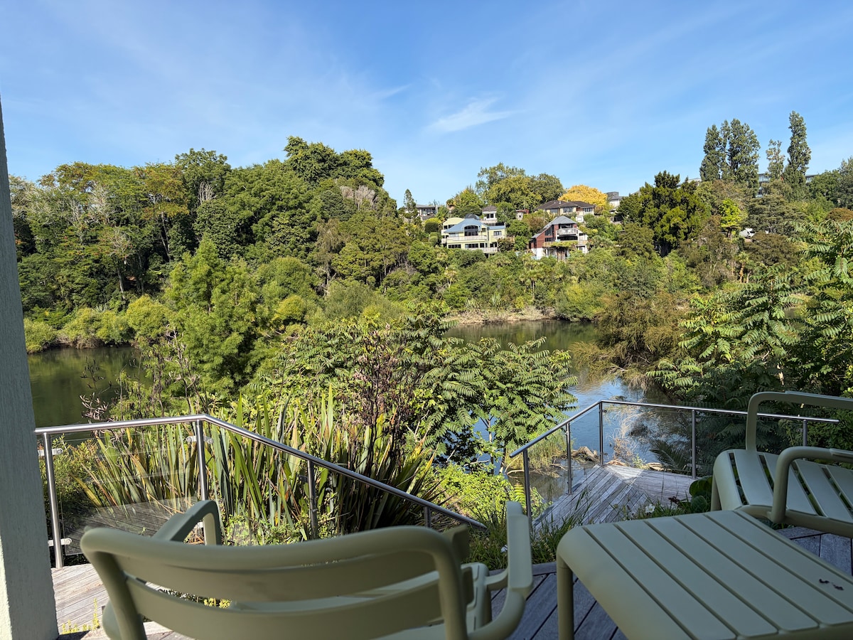 Welcome to your private lakeside escape! Enjoy stunning lake views, relax in the Swim spa and stay in a spacious 4 Bedroom/ 3 Bathroom home. Centrally located and only a 10 to 15 minute walk, or a short drive, to the CBD, restaurants, Seddon Park or to Waikato Stadium. Mystery Creek and the Hamilton Airport are 14km away. Perfect for families or groups. Free parking, full kitchen, and fast Wi-Fi included. Tesla & EV charger onsite