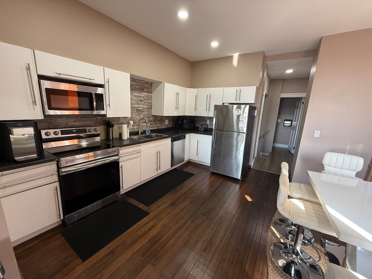Bu unikal məkan hər şeyə yaxındır (təfərrüatlar üçün "Daha çox göstər" üzərinə klikləyin) *Lüks Yuxu Yastıqları/matras/üstlük/döşəkağları *Teatr mövzusu: Directv ultimate paketi ilə BÖYÜK 85 düymlük TV, teatr kresloları, popkorn maşını *Əsas yataq otağında 50 düymlük televizor *Blokda paltaryuyan və quruducu yoxdur *Küçədə və küçədən kənarda pulsuz parkinq *Mətbəx yaxşı təchiz olunub *uşaq üçün yüksək stul / packNplay beşiği sorğu əsasında