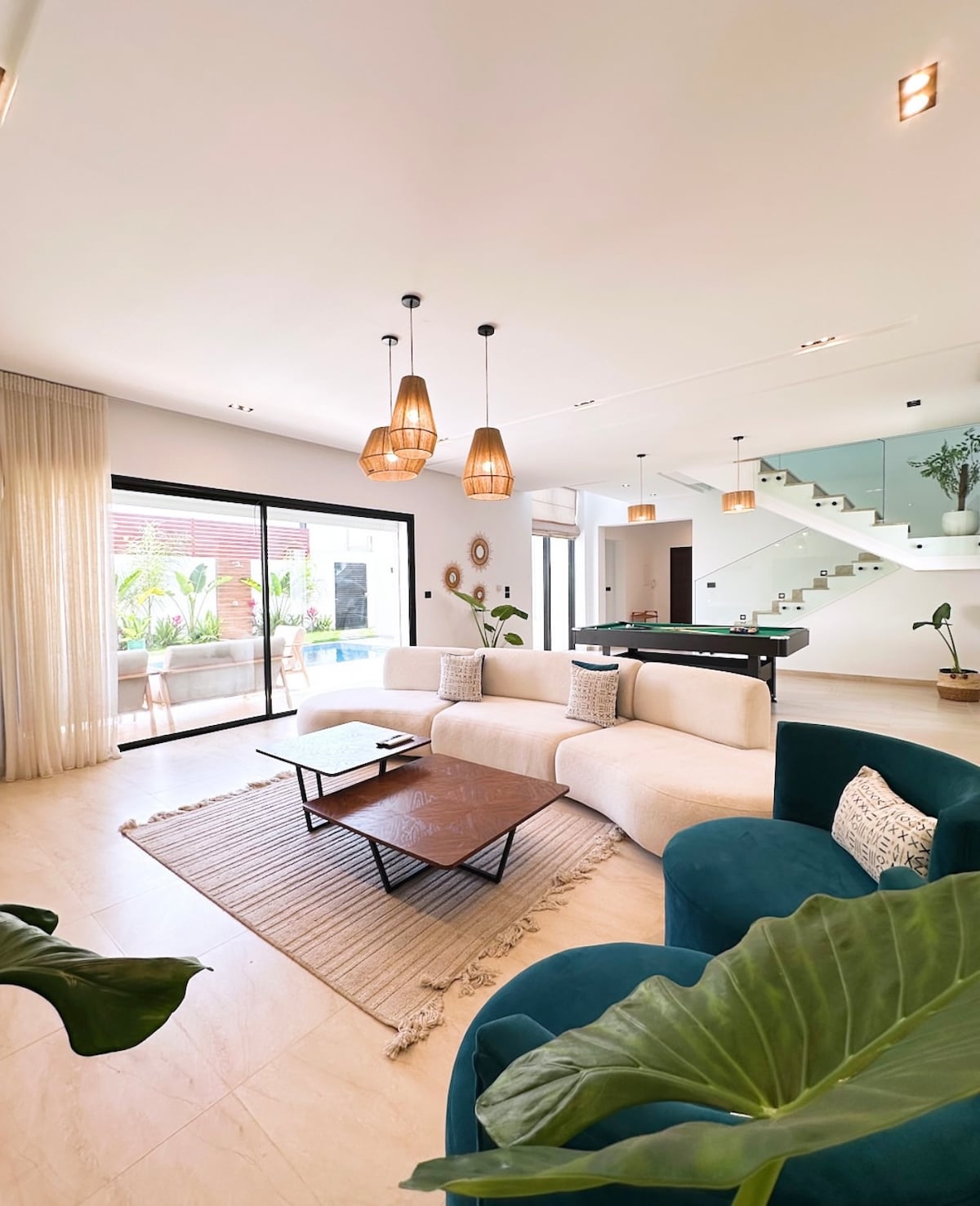 Magnifique villa style balinais, idéalement située à Hammamet Sud, à proximité de toutes les commodités. À moins de 900m de la plage, cette villa est un petit bijou de tranquillité ! Elle dispose de : - Un jardin tropical avec une grande piscine style balinais, un coin barbecue, un grand garage pouvant accueillir 4 voitures, un ping-pong - Un grand salon avec une télé 4K de 75 pouces et un billard - Une cuisine très bien équipée - 3 suites avec dressing et SDB - Une chambre et une salle d’eau