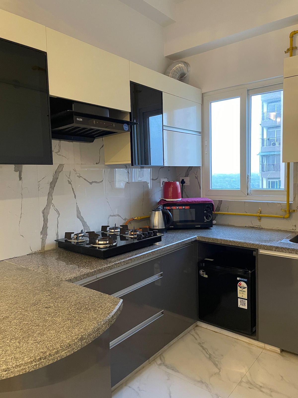 Gündüzlər mənzərəli yaşıl mənzərəyə, gecələr isə şəhər işıqlarına açılan gözəl mənzərəsi olan tam təchiz edilmiş, dəbli, dəbdəbəli studiya bloku. İşgüzar səyahətçilər, tələbələr və ya cütlüklər üçün istirahət və dincəlmək üçün mükəmməl yer. Salam sürətli internet mövcuddur və uzaqdan işləməyi dəstəkləyə bilər. Binada pulsuz, təhlükəsiz parkinq mövcuddur. Ekspo Mart-a 5 dəqiqəlik məsafədə, Pari Chowk və Jaypee Resort-a 8 dəqiqəlik məsafədə yerləşirik. Evdə bişirilmiş yeməklər mövcuddur.