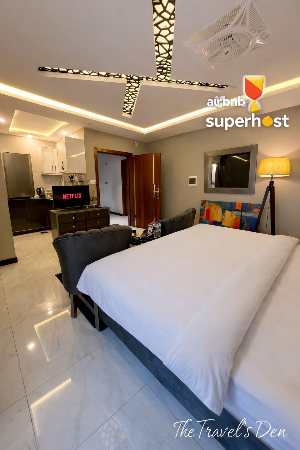 Elegant 2-Bedroom Apartment Near Islamabad Airport Stay in a stylish, fully furnished 2-bedroom apartment just minutes from Islamabad International Airport ideal for business travelers, families, and transit guests. The apartment offers a fully equipped kitchen, air conditioning, hot and cold water, fast WiFi, and 55’’ ultra 4k TV for your comfort and entertainment. Enjoy hassle-free check-in, lift access with key card security, and a peaceful, secure neighbourhood for a relaxing stay.