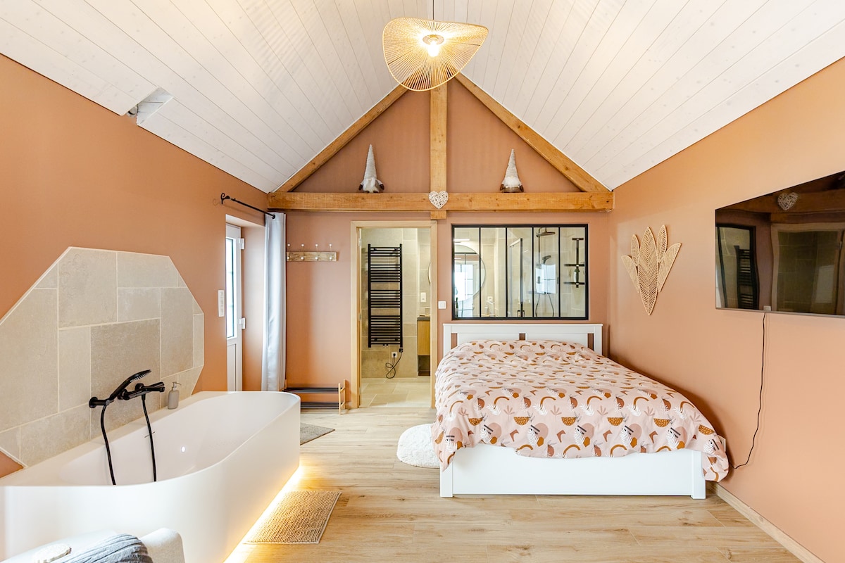 Loft du Presbytère il boyu açıq olan özəl cakuzi və sauna, eləcə də asma terrası olan parlaq bir yerdir. Maksimum 2 böyük və 2 uşaq üçün nəzərdə tutulub. Bağda meyvə ağacları, yayda tərəvəz bağı, 5 toyuq var və tez-tez Hüqet və Qribuy keçirlər 🐈🐈⬛ Məkan cütlük və ya ailə olaraq dincəlmək, sakitliyin və sağlamlıq qonaqlamasının dadını çıxarmaq üçün idealdır Məkanın təbiət qoynunda yerləşməsi sizi yavaşlamağa və anın tam zövqünü yaşamağa dəvət edir.