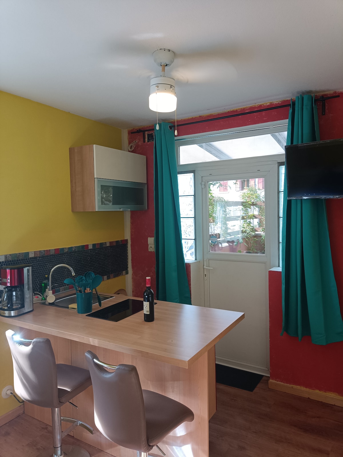 In the heart of the Alsatian vineyard, located on the wine route, guest room with private bathroom (shower, sink, WC) and equipped kitchen (fridge, hob, extractor hood, dishwasher, sink, cupboards), floor heating. Sheltered and private terrace to eat outside Parking space along the property, in the immediate vicinity of the accommodation