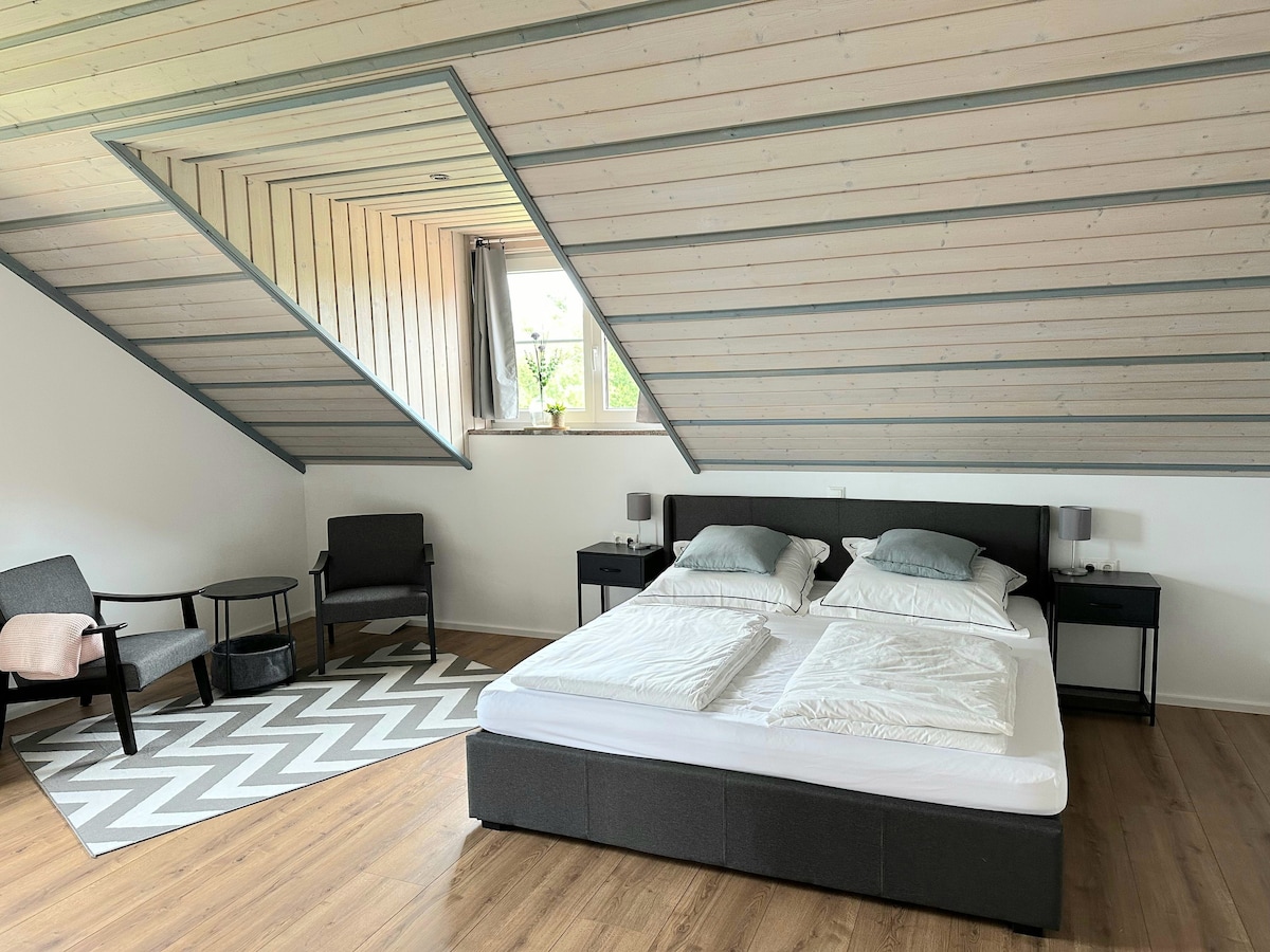 Əvvəllər ferma olan bu sakit yer ailələr/qruplar üçün mükəmməldir. Mənzil fərdi yaşayış evinin 1-ci mərtəbəsindədir. Mənzilin sahəsi təxminən 100 m²-dir və 6+2 yataq yeri təklif edir. Ev pulsuzdur, tarla və çəmənliklərlə əhatə olunub. Ən yaxın şəhər təxminən 2 km məsafədədir. Burada çörək zavodu, qəssab dükanı, eləcə də burjua alman mətbəxi olan restoran tapa bilərsiniz. Magistral yola (A7) birbaşa bağlantı təxminən 3 km məsafədədir.