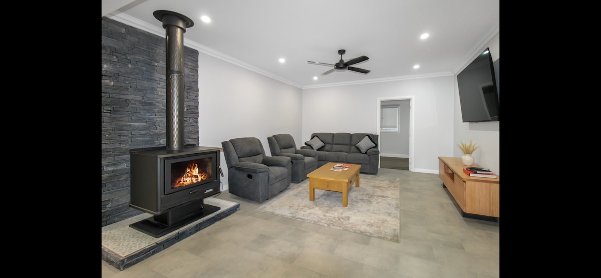 Enjoy a stylish experience at this centrally located place. with a fully enclosed yard and large outdoor area 3 large bedroom each with own tv and split system a stylish modern bathroom and ensuite a modern kitchen with all cooking facilities and a outdoor kitcken large woodfire and modern laundry and office
