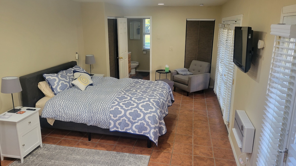 The newly renovated Garden Chalet offers a serene one-bedroom, one-bathroom ground floor unit. It includes a private entrance, living room, and full kitchen. Guests share access to a spacious backyard with seating areas, a firepit, and a landscaped waterfall (owner lives upstairs). There is a dedicated parking area that leads to the Garden Chalet's private entrance .
