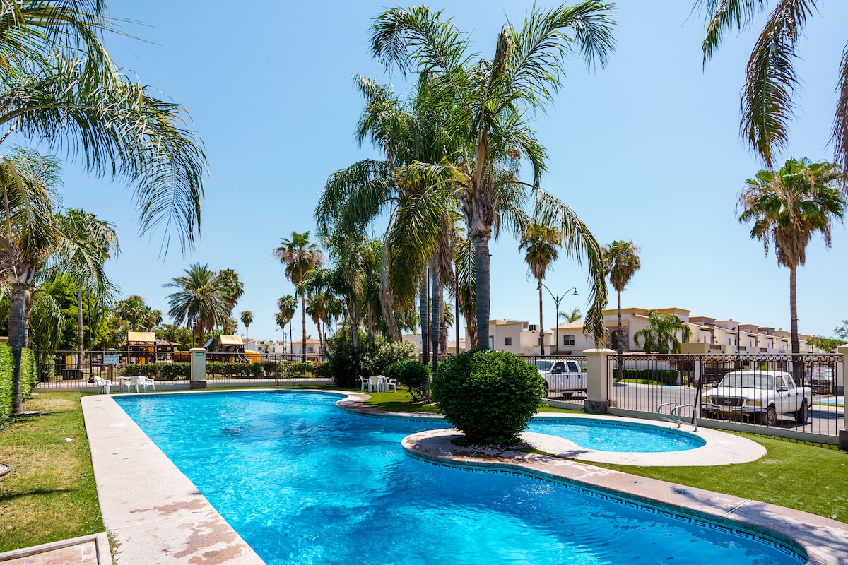 Sakit, nəzarətli girişli, ailə və ya işgüzar səfərlər üçün ideal olan rahat 2 mərtəbəli ev. 2 yataq otağı, 180-220 sm ölçülü və tək çarpayılar, 1,5 hamam otağı, avadanlıqlarla təchiz olunmuş mətbəx və 2 avtomobil üçün örtülü parkinq var. Günə qəhvə və ya techado idman zalında məşq ilə başlayın. Gün batanda evin qarşısındakı oyun meydançasında ailəlikcə dincəlin və ya bağçanın gözəlliyindən zövq alın. Konsulluq, CRIT, Xüsusi Xəstəxana, CIMA və Hökumət Mərkəzindən cəmi bir neçə dəqiqəlik məsafədə.