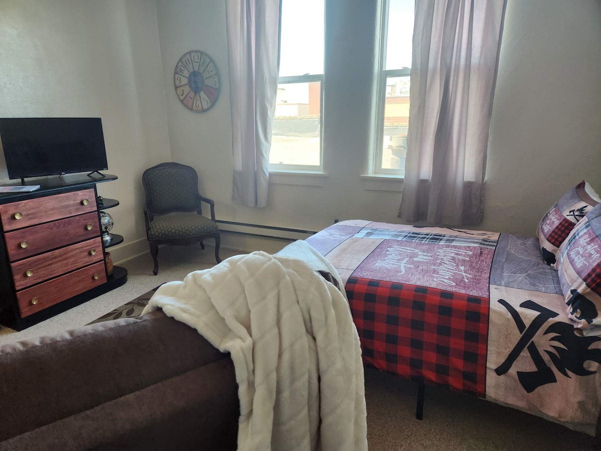 Super cute & cozy Studio in the heart of downtown Havre. This unit has a combined living & sleeping area with a full size bed. It has a full kitchen & bath. Walking distance to local wine bar, friendly taverns, dining, grocery store, movie theater, library, shopping & salons. Built in the early 1900's, you will find some original details remain, however, we have made every effort to make it comfortable! Apartment is located on the 2nd floor & there is an extra long stairway with no elevator.