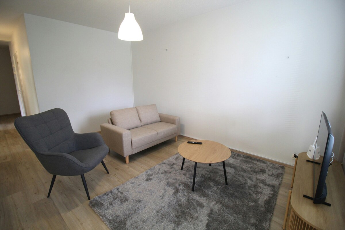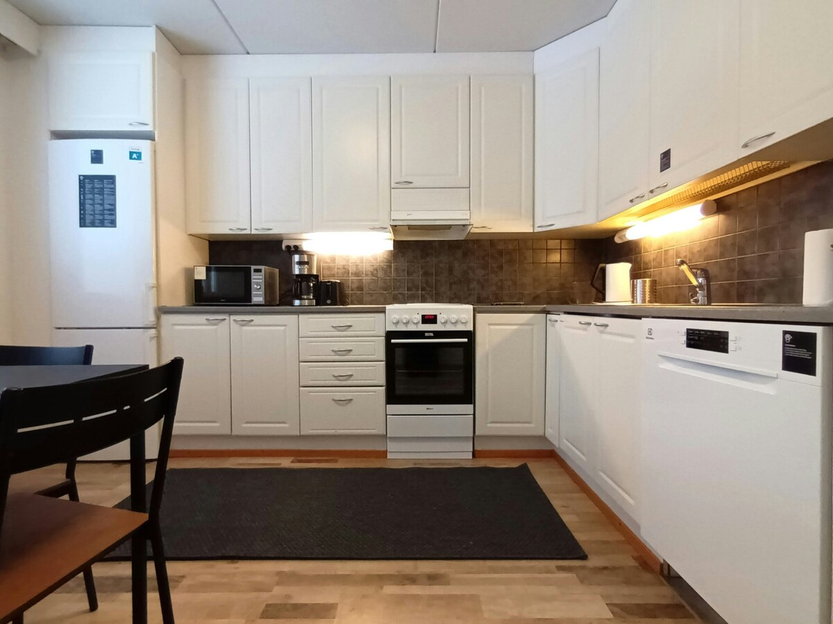 Cozy two-bedroom apartment in central Lahti, ideal for four guests. Features a private sauna, spacious bathroom, well-equipped kitchen, and garage parking. Includes four separate beds, bed linen, and cleaning supplies.