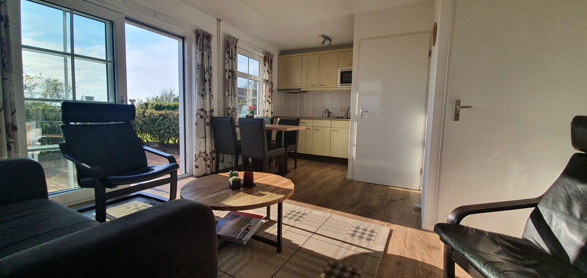 De sfeervolle chalet staat op Parc Koudenburg in Hollum, dichtbij het dorp, de vuurtoren en het strand. De chalet is geschikt voor 4 personen. Voorzien van TV, Wifi en verwarming. Gezellige woonruimte, open keuken (oven, grote koelkast en vriezer, Nespresso koffie apparaat). Slaapkamer met 2-persoonsbed en slaapkamer met 2 enkele bedden. Badkamer met douche en toilet. Inclusief bedlinnen , handdoeken en keukenset Ruime tuin met tuinset, eettafel en parasol. Binnen roken is niet toegestaan.
