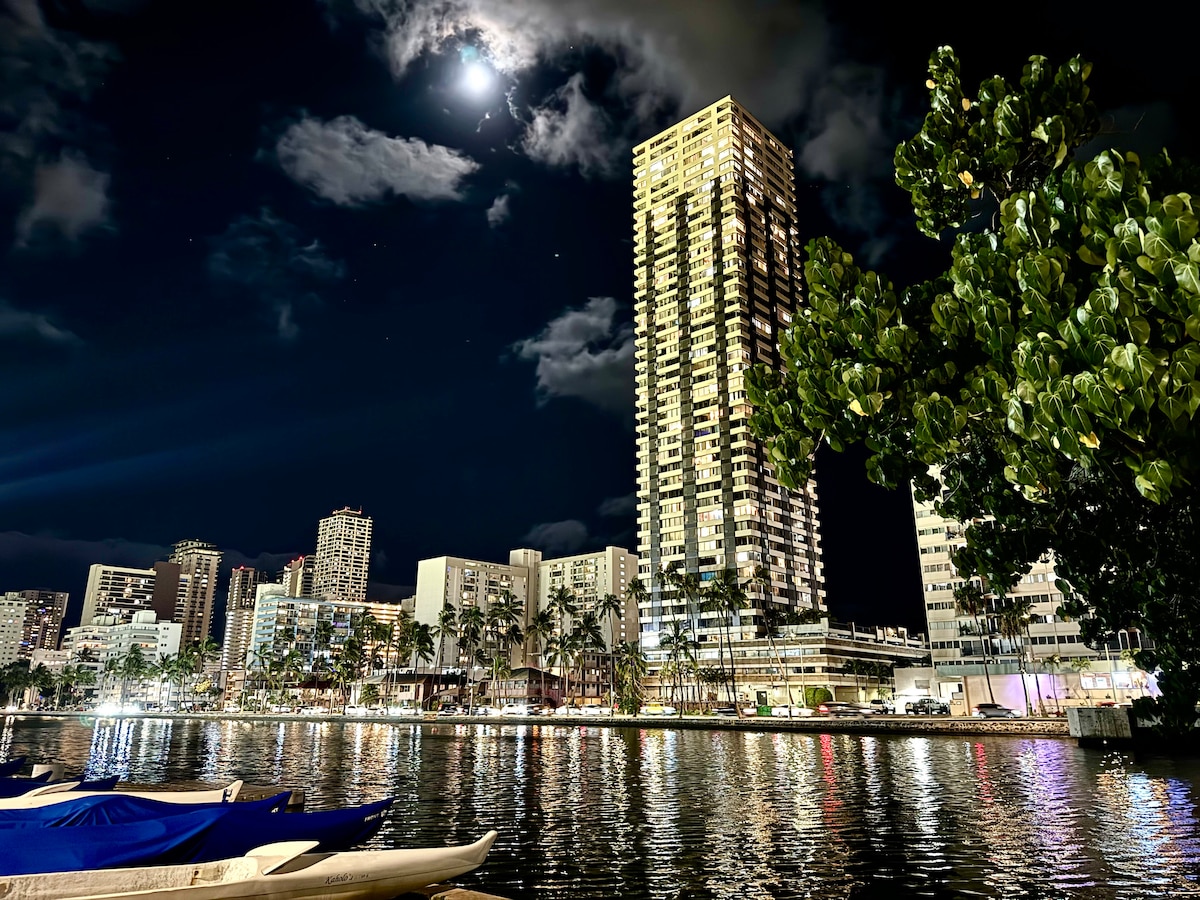 Bu ev Vaikikinin əsas yerinin və pulsuz parkinqin nadir birləşməsini təklif edir. Restoranlar, alış-veriş, çimərliklər və əsas turistik yerlər piyada məsafədədir, bu da Vaikikidən avtomobilsiz və ya avtomobilsiz zövq almağı asanlaşdırır. 2025-ci ilin fevral ayında təzəlikcə təmir edilmiş məkanda müasir interyer və Ala Vay Kanalı, qolf meydançası və hovuzun rahat mənzərələri var. Cütlüklər və kiçik ailələr üçün ideal olan bu yer Vaikikidə qalmağınız üçün rahat və əlverişli bir bazadır